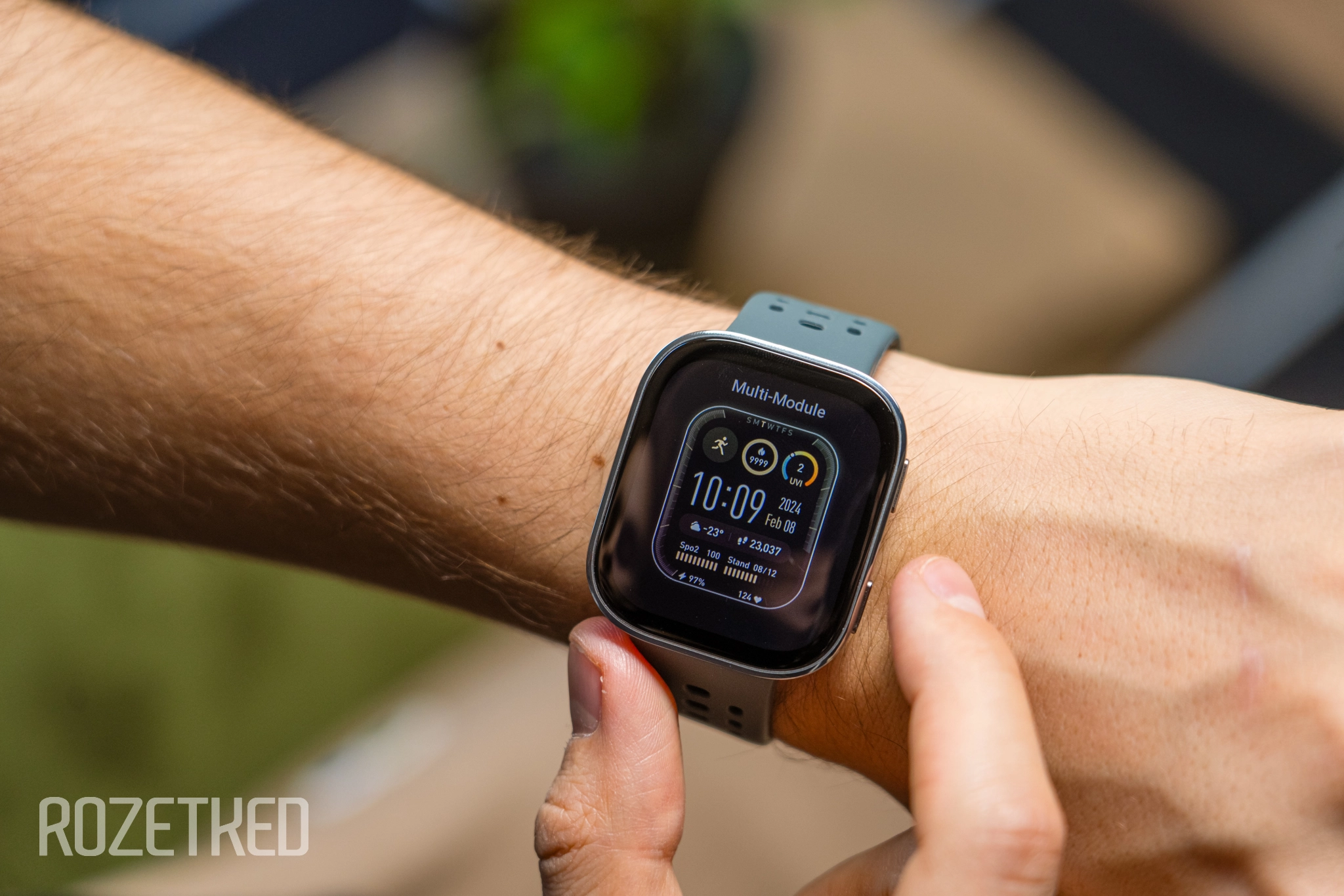 У Amazfit Bip 6 достаточно крупный и яркий 1,97-дюймовый AMOLED-дисплей с разрешением 450×390 пикселей и отличной чёткостью плотностью 302 ppi. На экранах принято экономить, но тут денег не пожалели. Как результат — сочная и качественная картинка с чёткими шрифтами. Заявлена яркость до 2000 нит: по ощущениям, показатели соответствуют заявленным, всё на экране отлично видно в погожие апрельские дни.