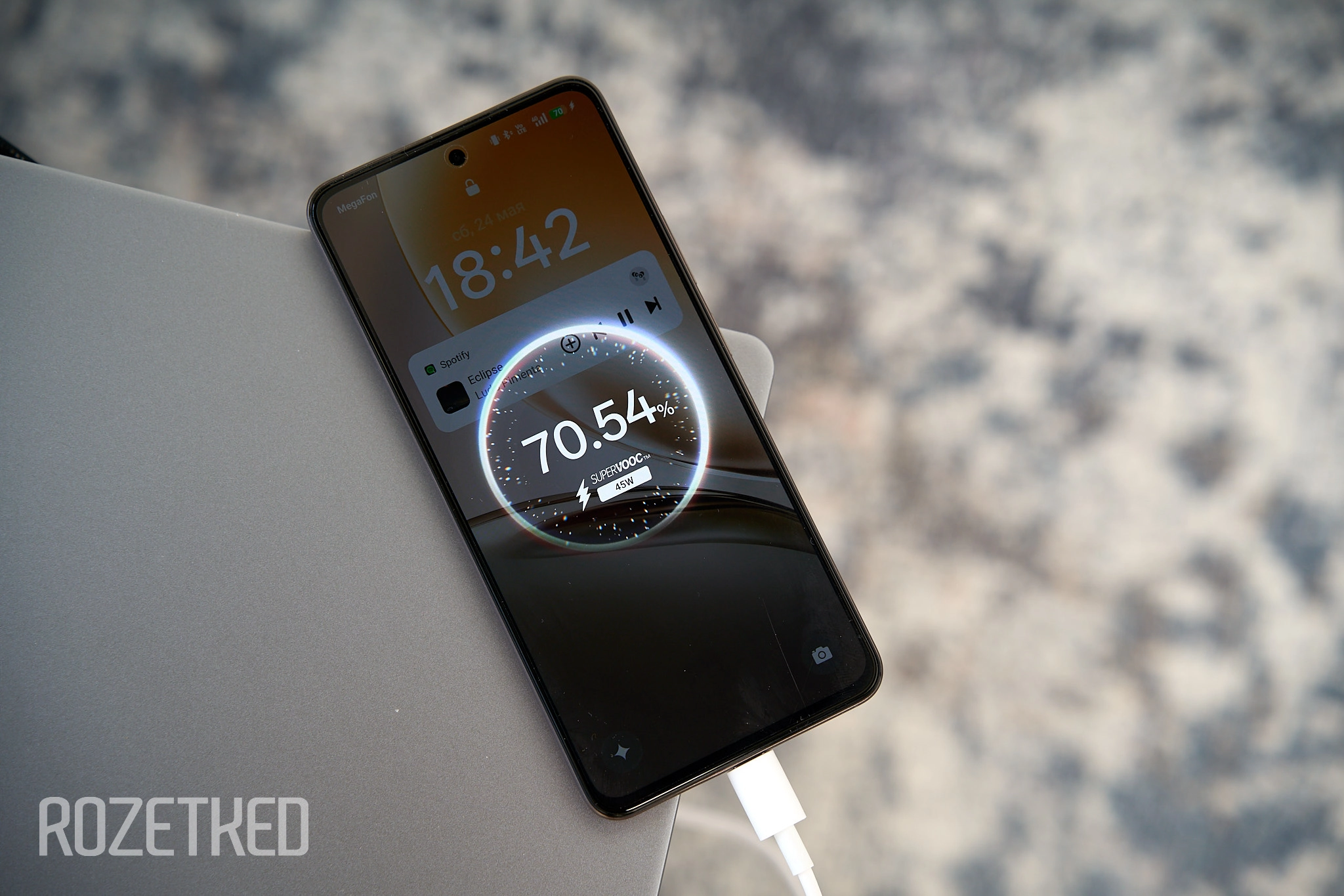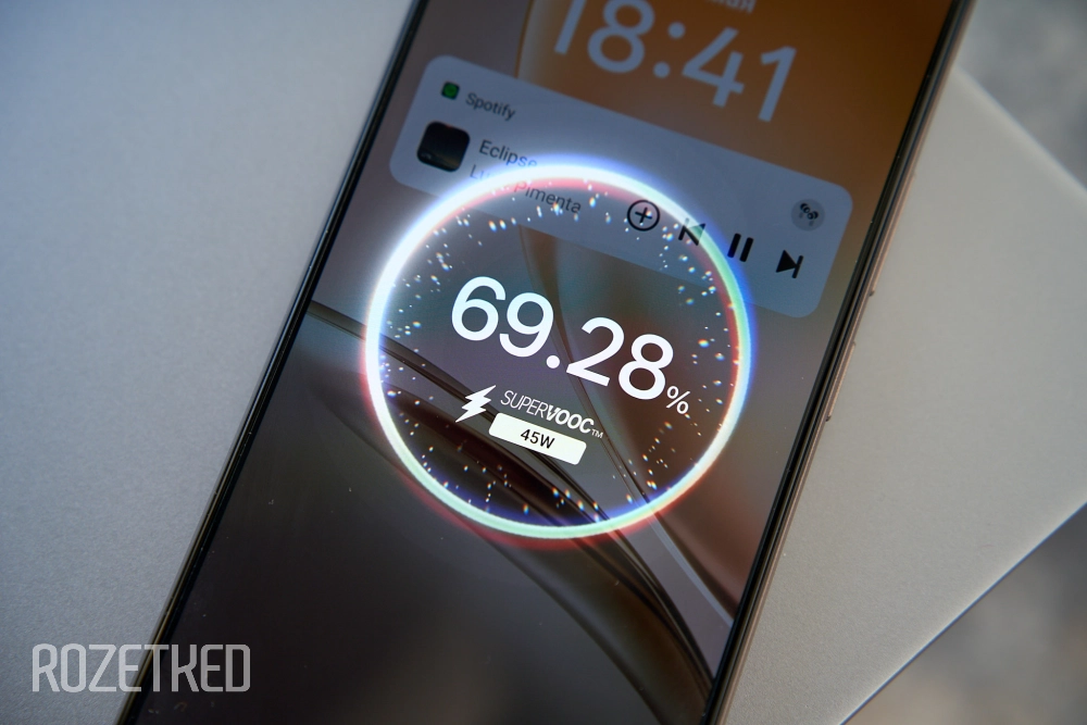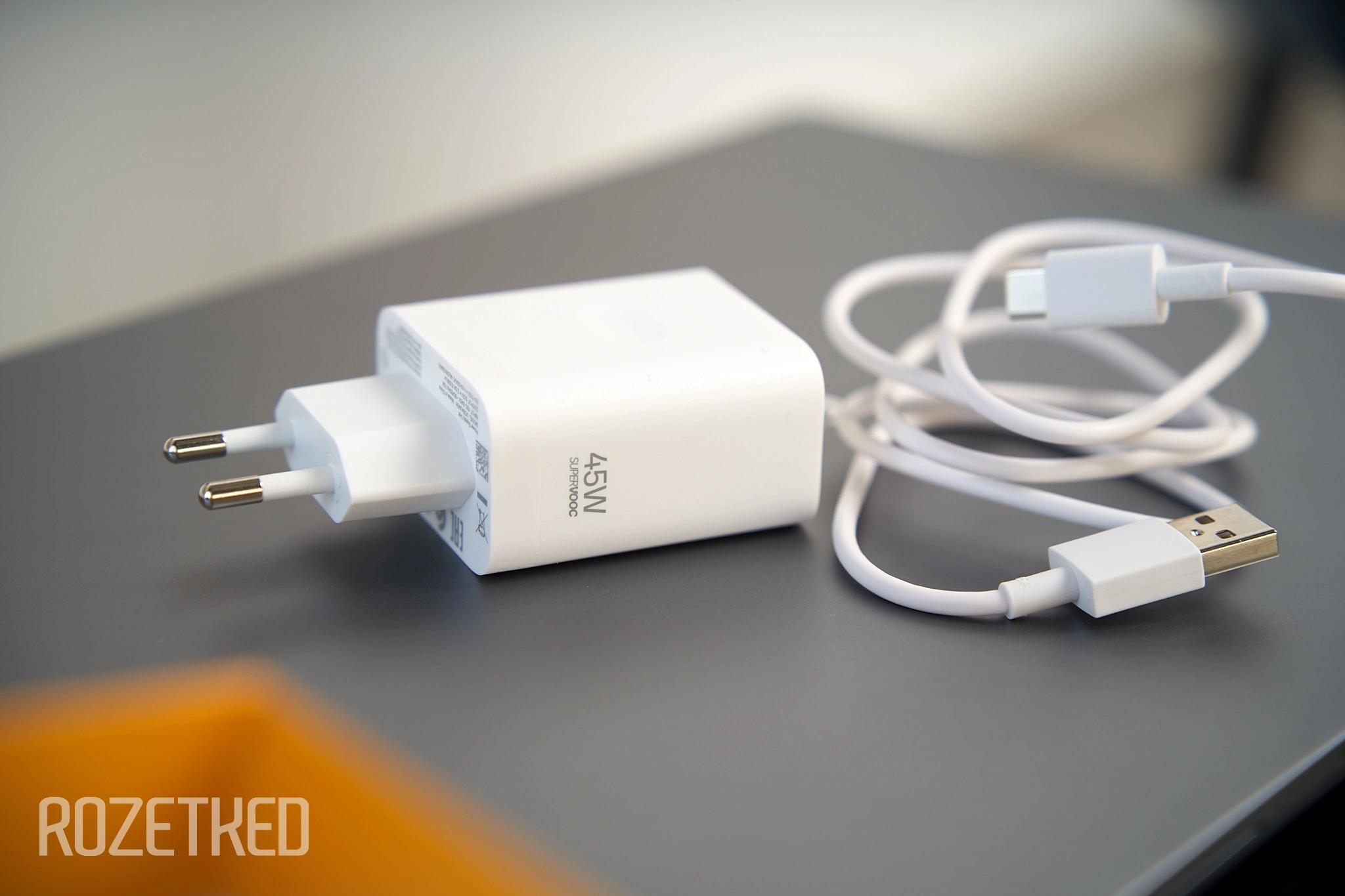В комплекте получаем зарядку SUPERVOOC на 45 Вт. Она работает в паре с кабелем с USB-A на Type-C, что не совсем современно. По заводским данным на полную зарядку смартфона требуется полтора часа: на практике так и получается, процесс идёт быстро. Хотя тут можно посетовать, что у прошлого поколения в комплекте была зарядка на 80 Вт и у realme 13 всё шло быстрее.