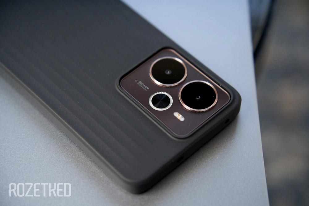 По факту камера тут одна — основная, на 50 мегапикселей и с оптической стабилизацией. Вторая, чёрно-белая, на 2 Мп — скорее, декоративный элемент. Такой себе «модуль-заглушка» с сенсором GalaxyCore GC02M1, от которого никакой пользы.