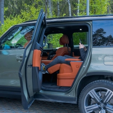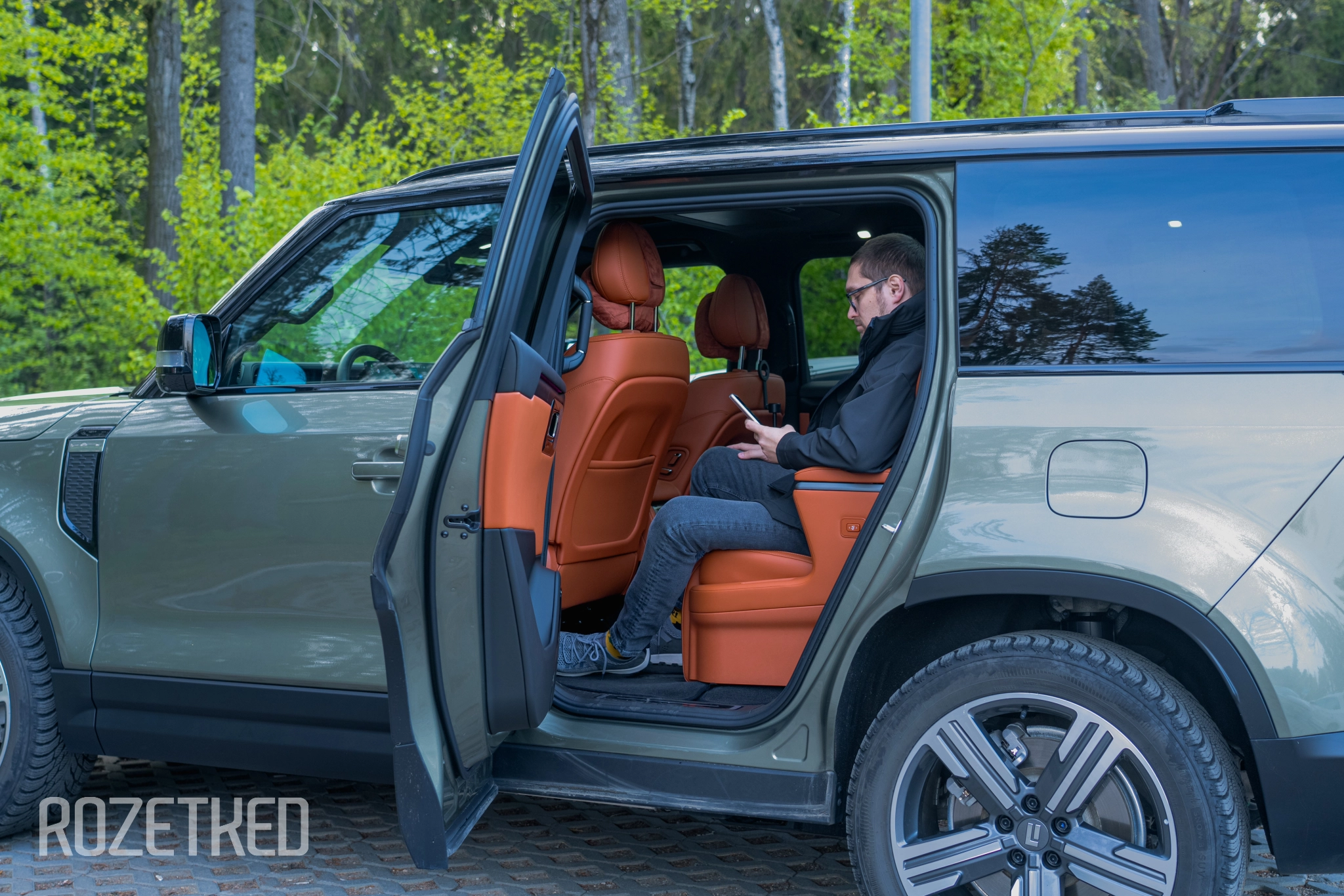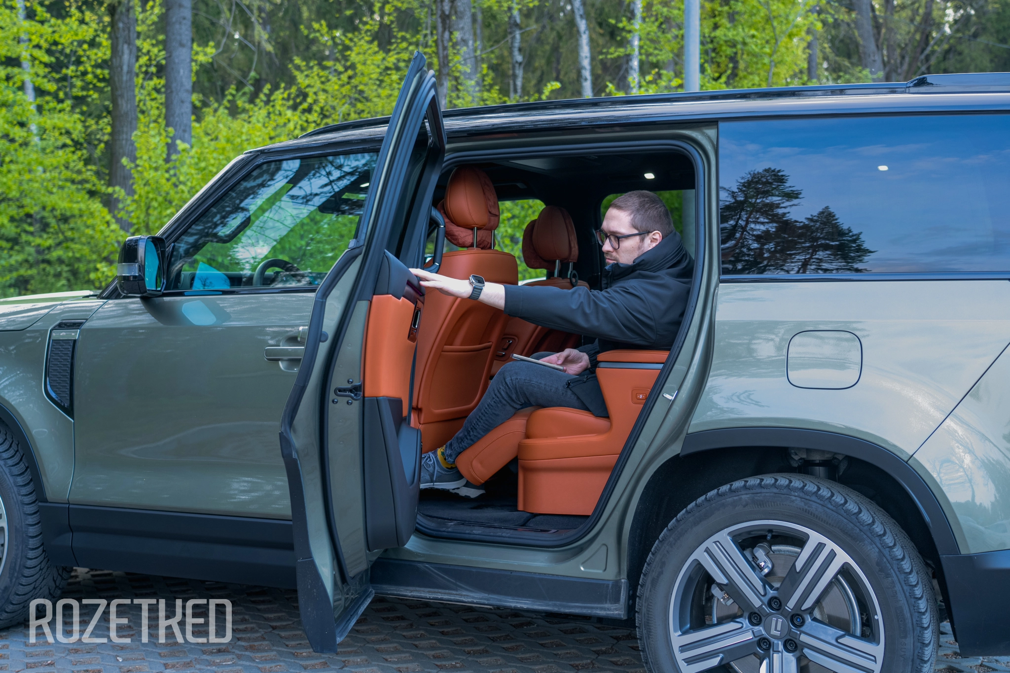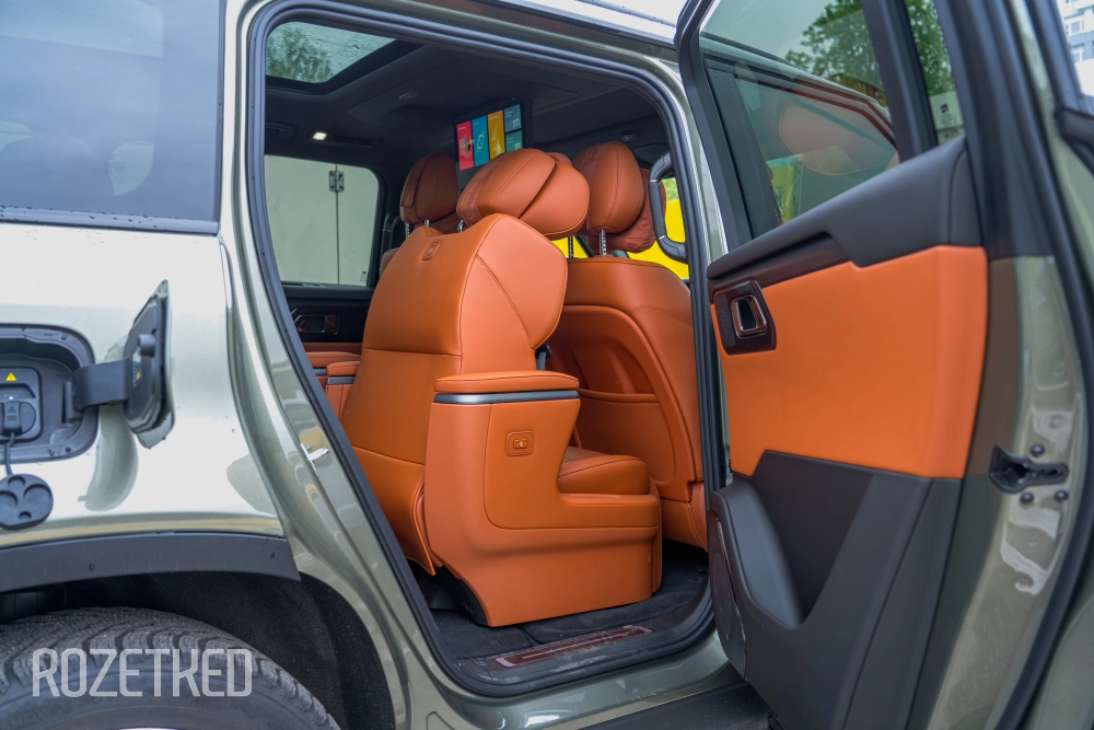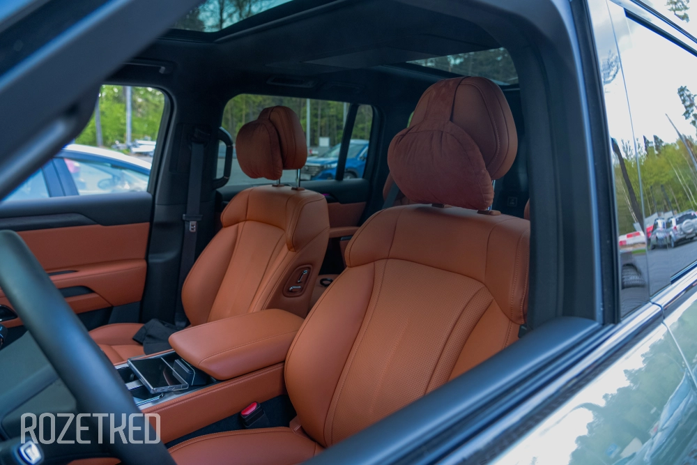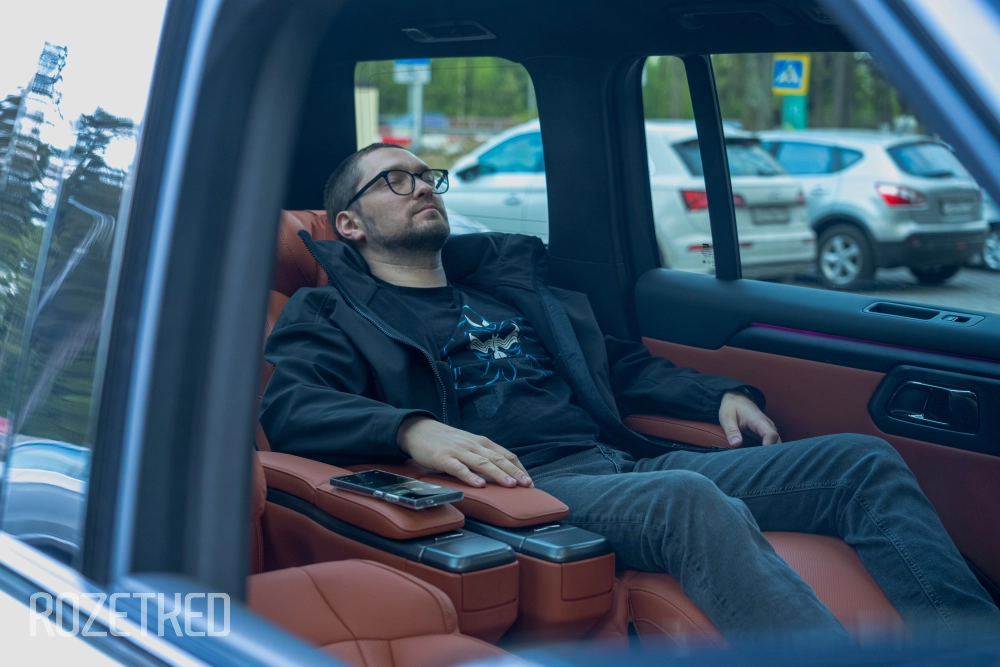 Со второго ряда и предлагаю начать знакомство. Во-первых, не сразу можно понять где же управление креслами, а оно спрятано в подлокотнике. Во-вторых, настройка тут многоуровневая. Можно просто двигать спинку, подушку и оттоманку, а можно включить полный релакс, при котором переднее сиденье откинется вперёд, кресло примет горизонтальный вид; запустите массаж и кайфуйте, как в первом классе самолёта. Есть подогрев и вентиляция, а также ионизация воздуха.