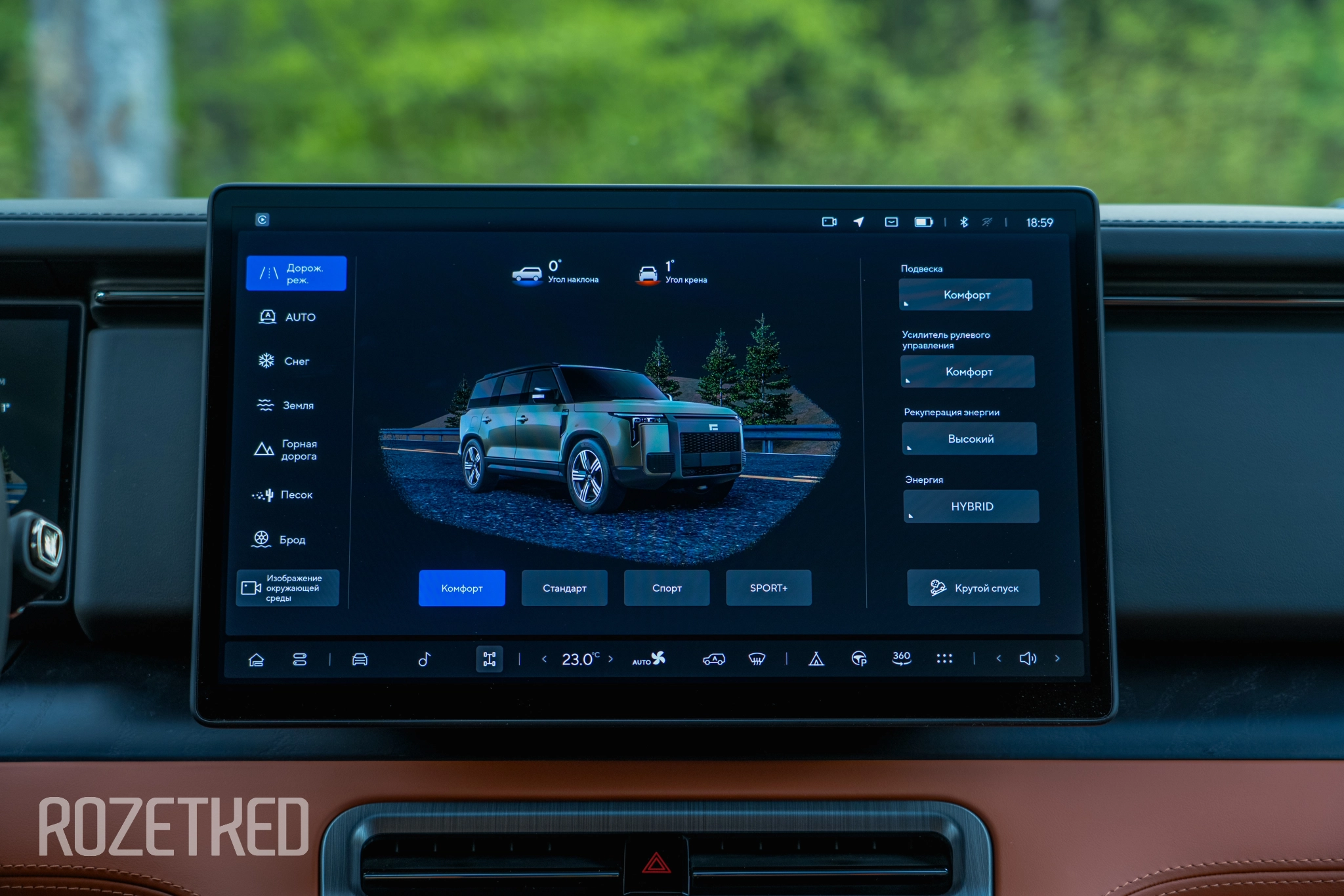 Всего тут есть четыре варианта работы «коробки» — комфорт, стандарт, спорт и спорт+. Честно говоря, комфорта тут за глаза для всех задач. Есть ещё переключатели дорожных режимов: авто, снег, земля, горная дорога, песок и брод. Отдельно настраиваются подвеска, усилитель руля и рекуперация. На моём опыте это первый автомобиль, где авто-режим работает идеально во всех условиях, нет необходимости что-то менять.