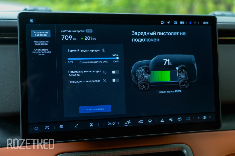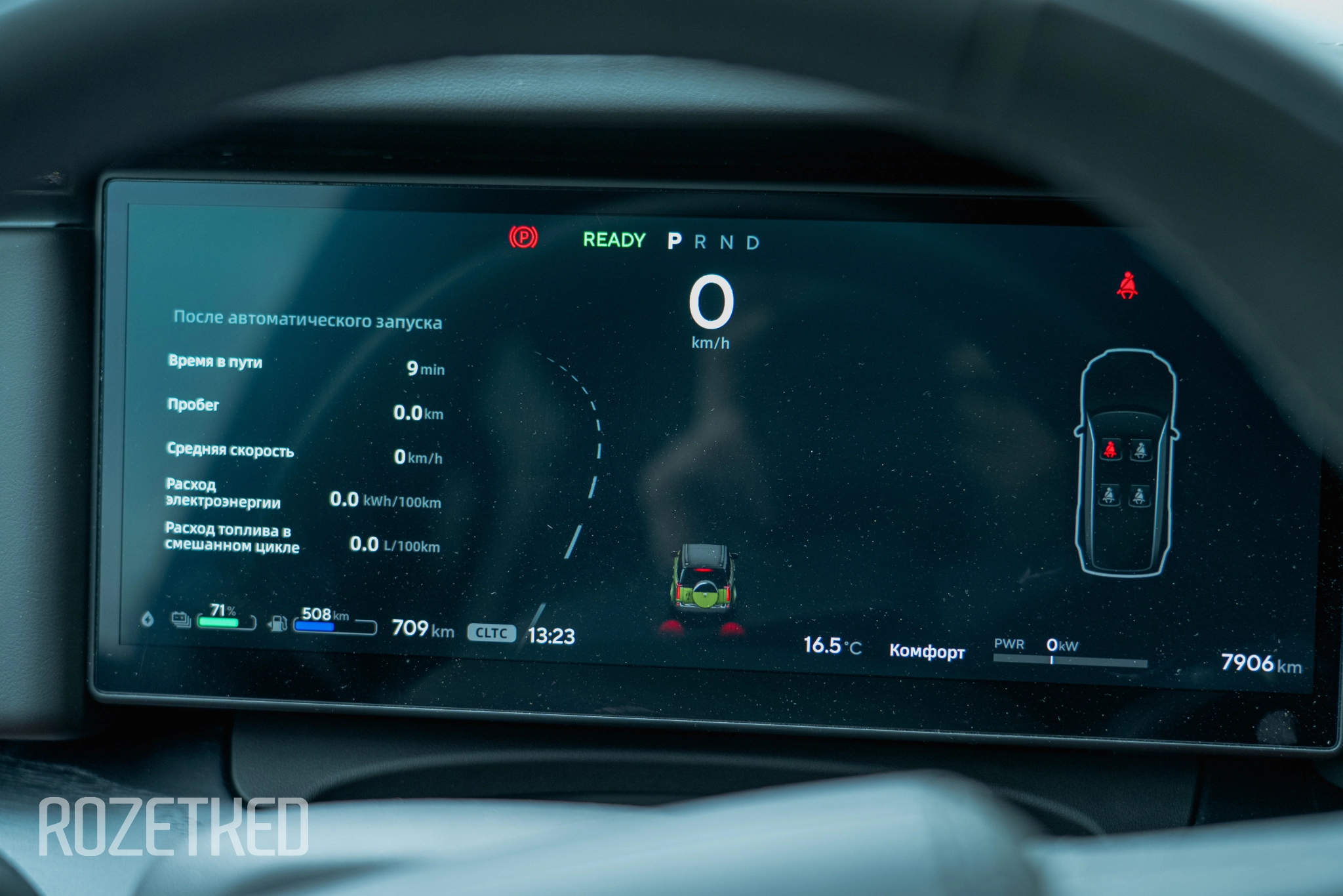 После пары дней езды включится ДВС (примерно на уровне 15–20%) и начнёт подзаряжать аккумулятор — но тоже лишь «доливает» его до ~25%. Другими словами, генератор работает, скорее, в режиме поддержания, а не полного цикла заряда. Есть функция принудительного включения бензогенератора, но работает только в режиме паркинга — то есть если хотите, вы можете оставить автомобиль и ждать зарядку до 80% (дальше просто не даёт).