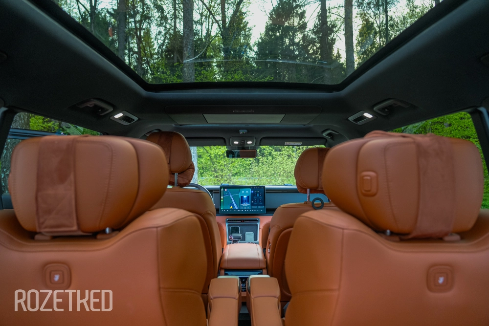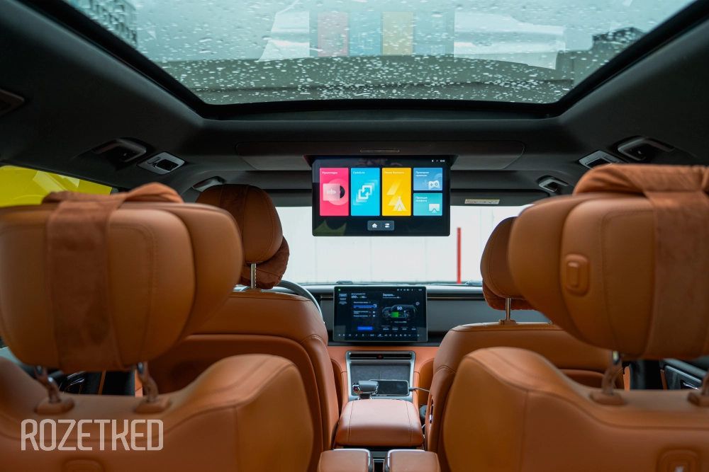 Между рядами в потолке есть откидывающийся экран. Но не без нюансов. Вывести картинку сюда сложно: либо использовать CarLink (трансляция экрана), либо завести модем в машину и транслировать через точку доступа. Но у задних пассажиров есть USB-C с быстрой зарядкой и поддержкой DisplayPort — с его же помощью можно передавать картинку на экран.