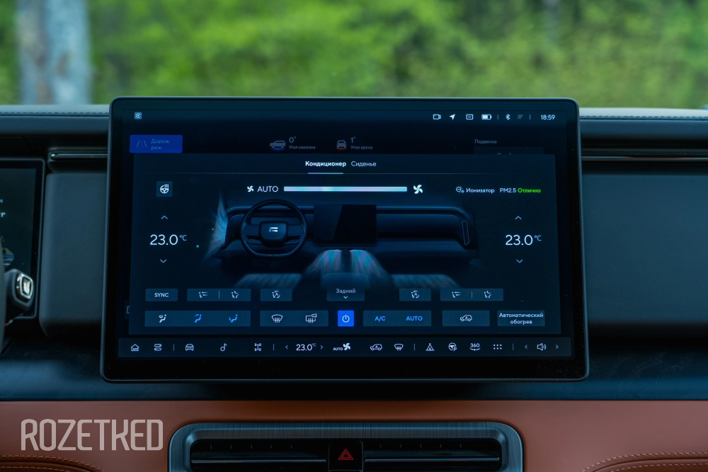 Климат-контроль — трёхзонный, с отдельными дисплеями и с выходами вентиляции для задних пассажиров. Из интересного: управлять дефлекторами вручную нельзя, они двигаются автоматически и не закрываются, но если вам сильно дует, в настройках можно выбрать рассеивающийся поток; удивлён, что никто больше так не сделал, работает классно.