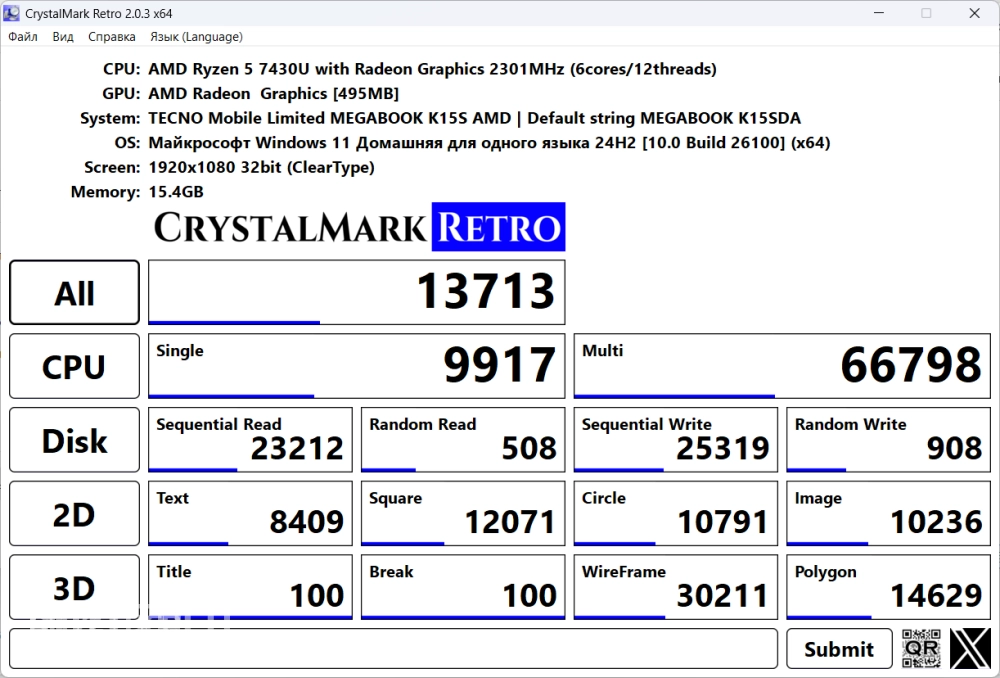 В нашем случае Megabook K15S получил AMD Ryzen 5 7430U. Это шестиядерник с 12 потоками, базовой частотой 2,3 ГГц и возможностью разгона до 4,3 ГГц. Графика — встроенная Radeon Vega 7, дискретки тут нет, но это и ожидаемо. Доступно 16 ГБ оперативной памяти DDR4 в двухканальном режиме, а при необходимости объём можно удвоить. Для хранения данных используется NVMe SSD-накопитель на 512 ГБ.