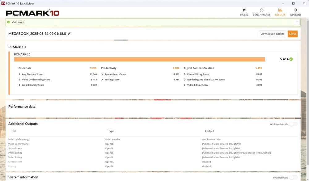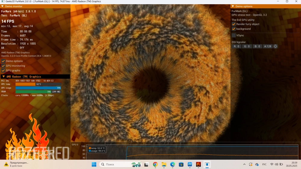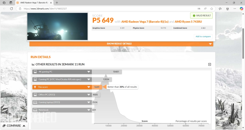В PCMark10 ноутбук набрал: 9205 баллов в разделе Essentials (офис, браузер, видеозвонки), 8508 — в Productivity (таблицы, документы), 5205 — в Digital Content Creation (работа с изображениями и видео). Общая оценка — 5499 пунктов. В одноядерной нагрузке Geekbench 6 показывает 1788 очков, в мультипотоке — 5801. Cinebench 2024 даёт 81 балла в однопотоке и 401 в многопотоке. В 3DMark — 5649 у процессора и лишь 865 у встроенной графики. Словом, Vega 7 — это не про игры, в Furmark выдала средние 14 fps на Full HD.