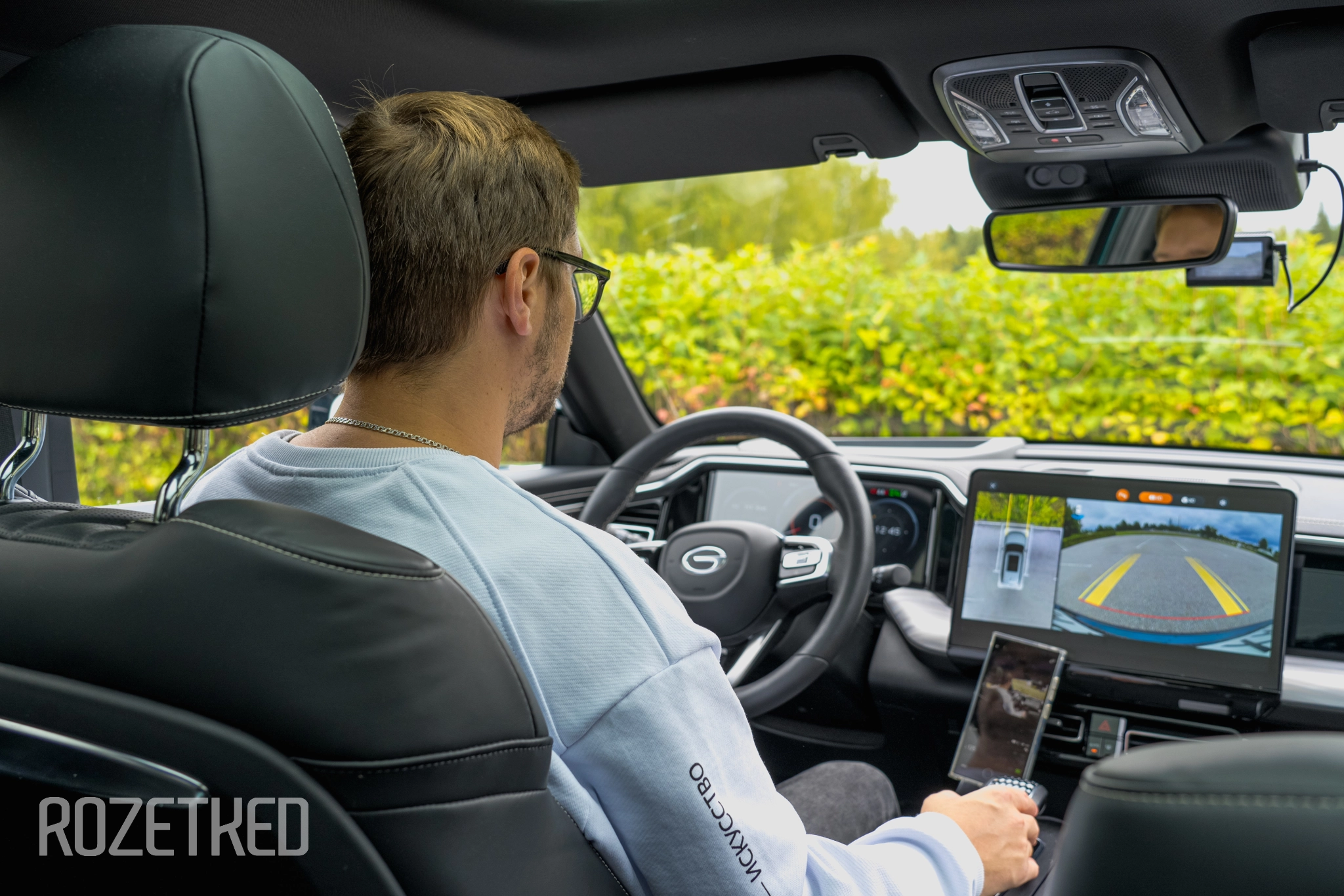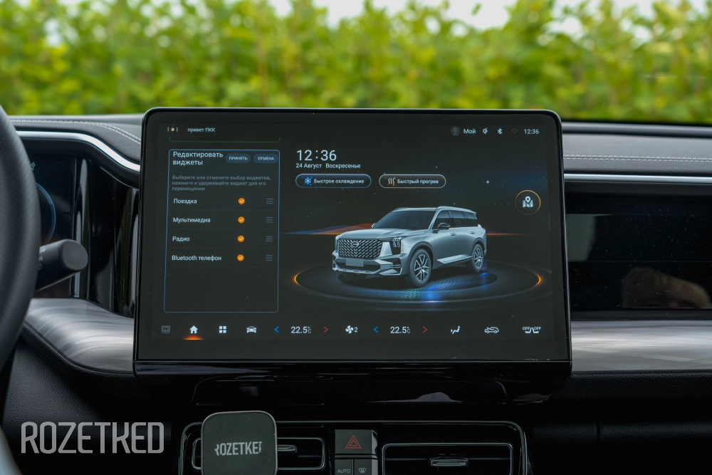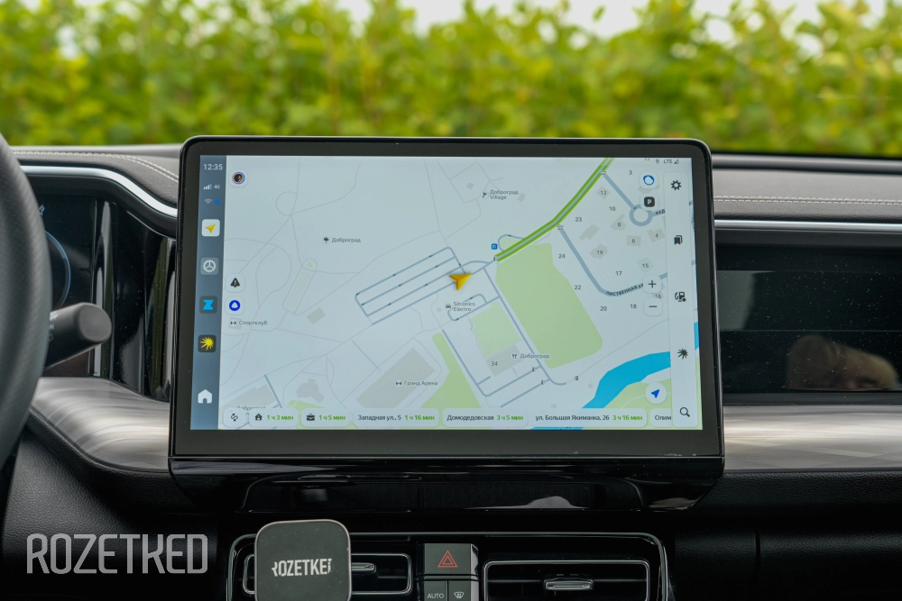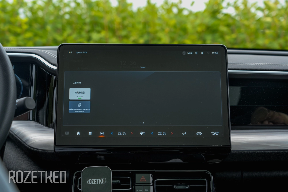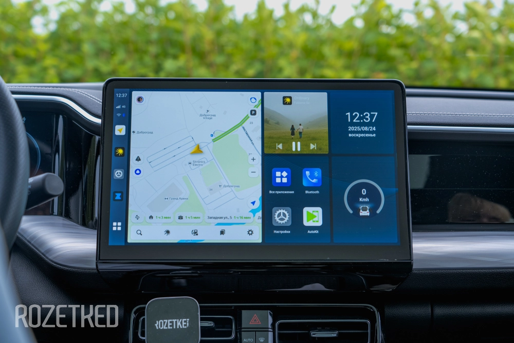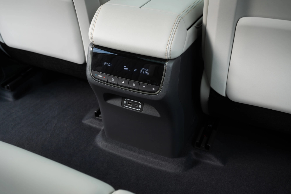 «Приборка», конечно же, цифровая. А как иначе в 2025 году? Размер у неё 12,3 дюйма. Ещё один маленький экранчик с набором физических кнопок доступен задним пассажирам. Можно самим активировать подогрев сидений и выставить температуру — климат-контроль же трёхзонный. Ну и пара портов USB-A тут же для зарядки мобильных устройств. Розетки 12 В в передней части салона и в багажном отделении так же пригодятся.