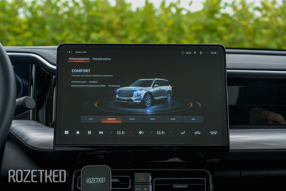 Ещё стоит отметить про режимы езды. Для них выведен отдельный переключатель рядом с кнопками на центральной панели. Есть «спорт», «эко», «комфорт», «снег» и «грязь». И это тот случай, когда я действительно часто их меняю. В пробках идеально подходит «комфорт»: вы трогаетесь плавно, но не медленно. «Спорт» — на трассе, сразу бодрый старт с места и разгон. При переключении настраивается степень нажатия педали и отклик двигателя.