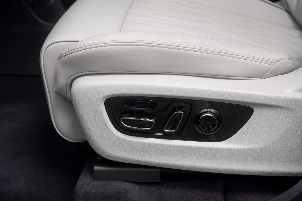 Передние кресла можно двигать в широком диапазоне: у водителя есть электрорегулировка в шести направлениях и поясничный подпор (горизонтально в поколениях 2024 года и горизонтально + вертикально в обновлённых моделях), плюс память положений.