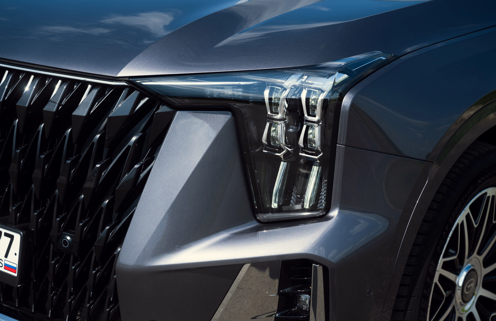 • GX Premium (2024) — имеет «обычную» для второго поколения GS8 решётку с горизонтальными ламелями и крупным логотипом, привычные бампера и 20″ диски. Хром в экстерьере умерен, рейлинги по-прежнему есть.