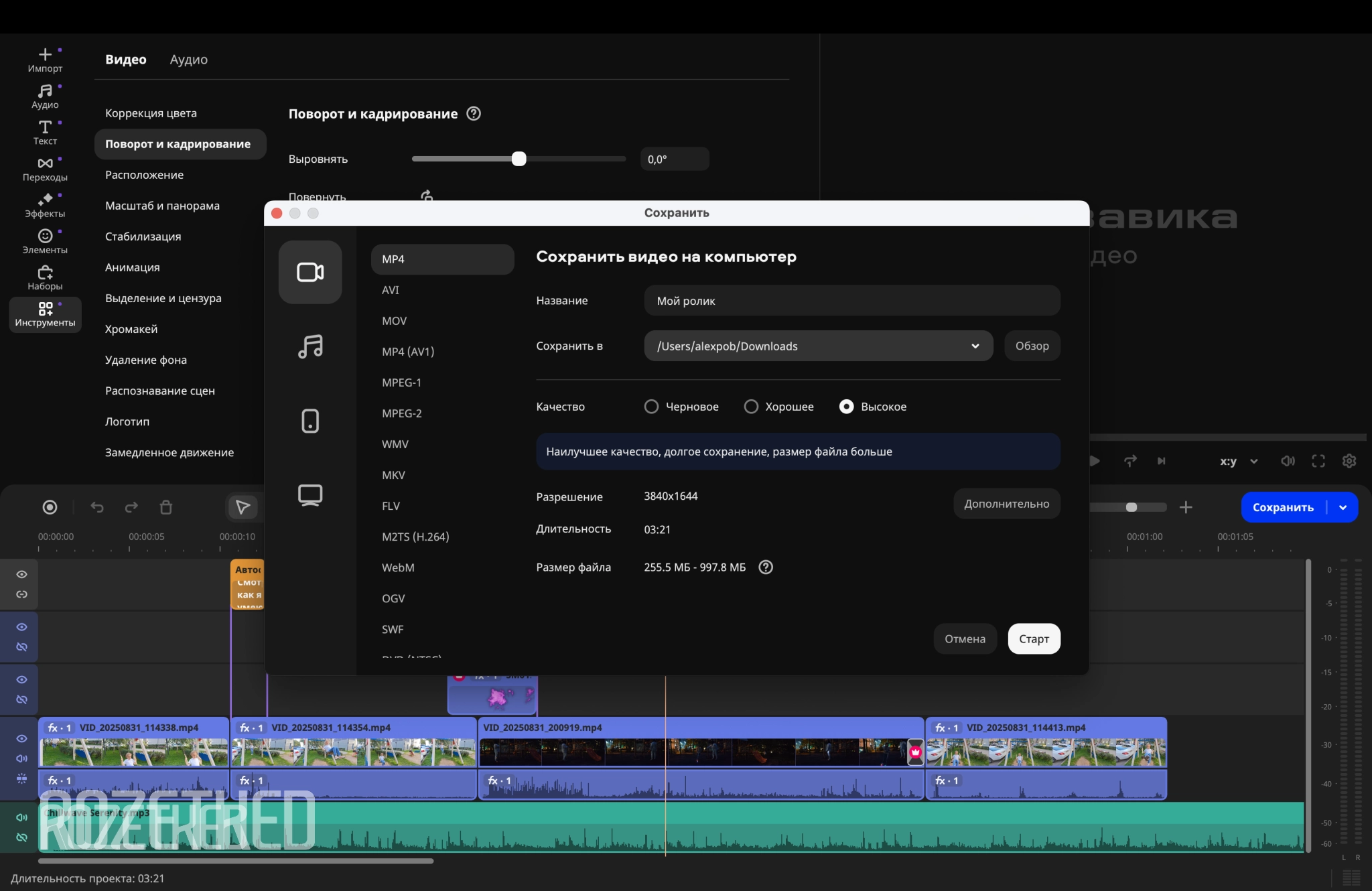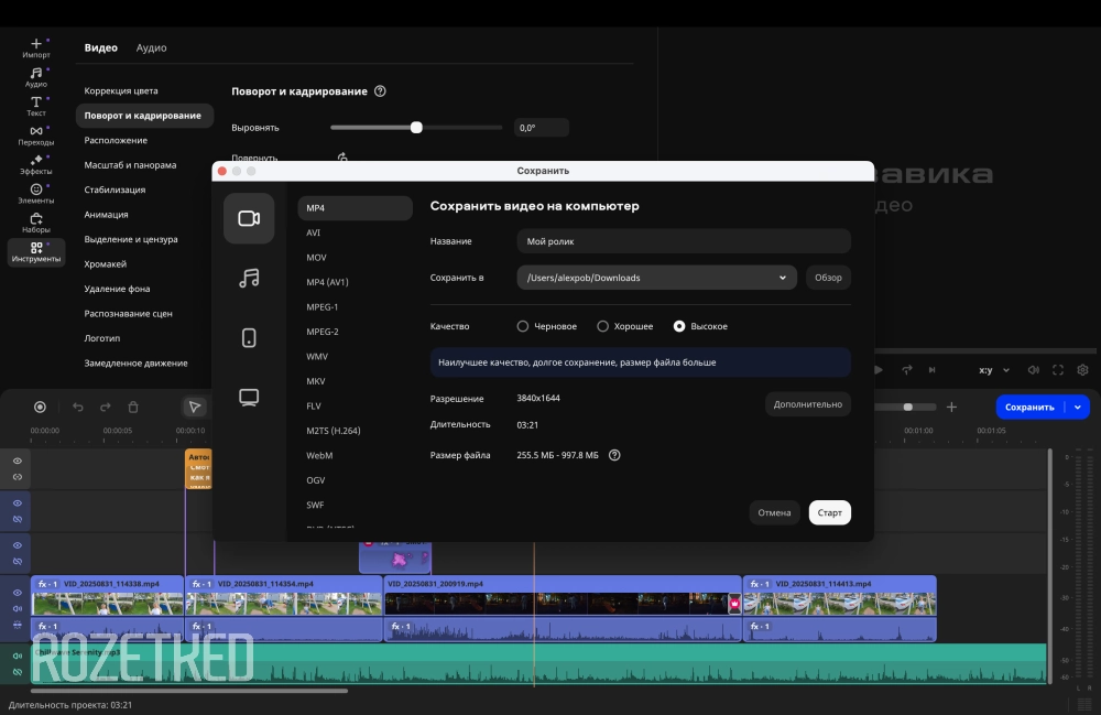 После сборки и монтажа ролика пора переходить к финальному этапу и экспортировать файл. Бывает, что на этом этапе начинаются неприятные моменты: непонятно, какой формат лучше выбрать; вывод ролика затягивается, начинается мучительное ожидание. В «Мовавика Видео» достаточно форматов (от MP4 и AVI до MOV), а также есть готовые пресеты для платформ вроде YouTube. Можно выбрать качество, битрейт, разрешение и сразу оценить, сколько будет весить итоговый файл.