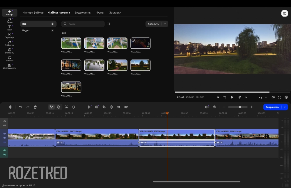 Главное окно делится на три зоны. Внизу расположен монтажный стол, или таймлайн: сюда отправляются видео, музыка и фото, и сразу видно, в какой последовательности они будут идти. Левее находятся библиотека и основные инструменты: обрезка, переходы, титры, добавление аудио. Справа — окно предпросмотра, чтобы проверить результат.