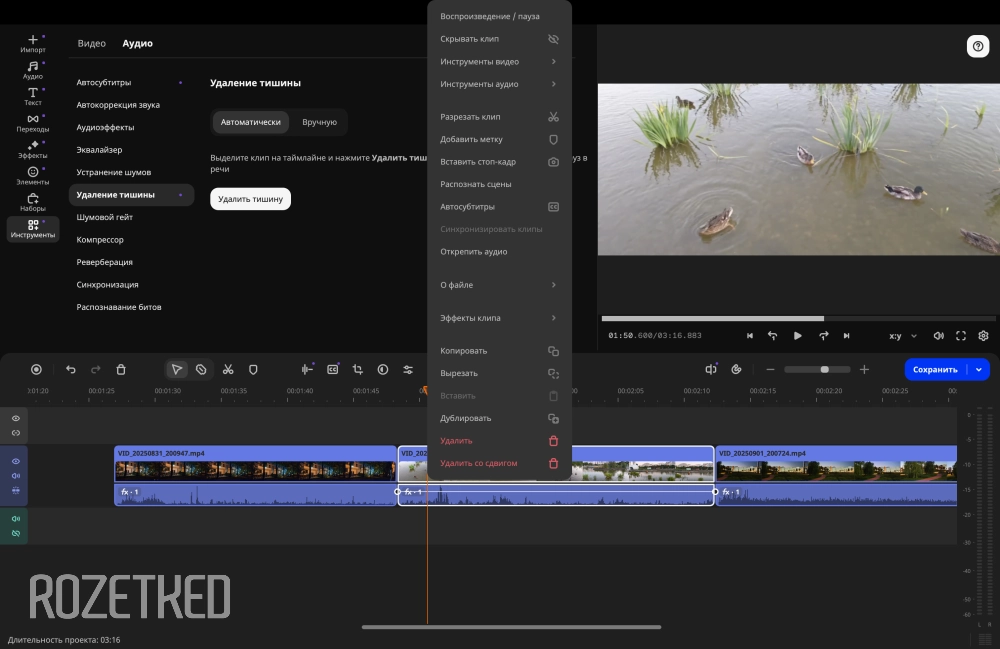 Ещё один необходимый элемент любого видео — это переходы: можно выбрать затемнения, перелистывания, сдвиги. Конечно, это не «режиссёрский уровень», но для плавного монтажа вполне достаточно. Когда ролик не рвётся на резких склейках, всегда складывается ощущение цельного проекта. А если хочется немного поэкспериментировать, можно попробовать дополнительные инструменты: базовую цветокоррекцию, стабилизацию, улучшение звука.