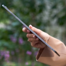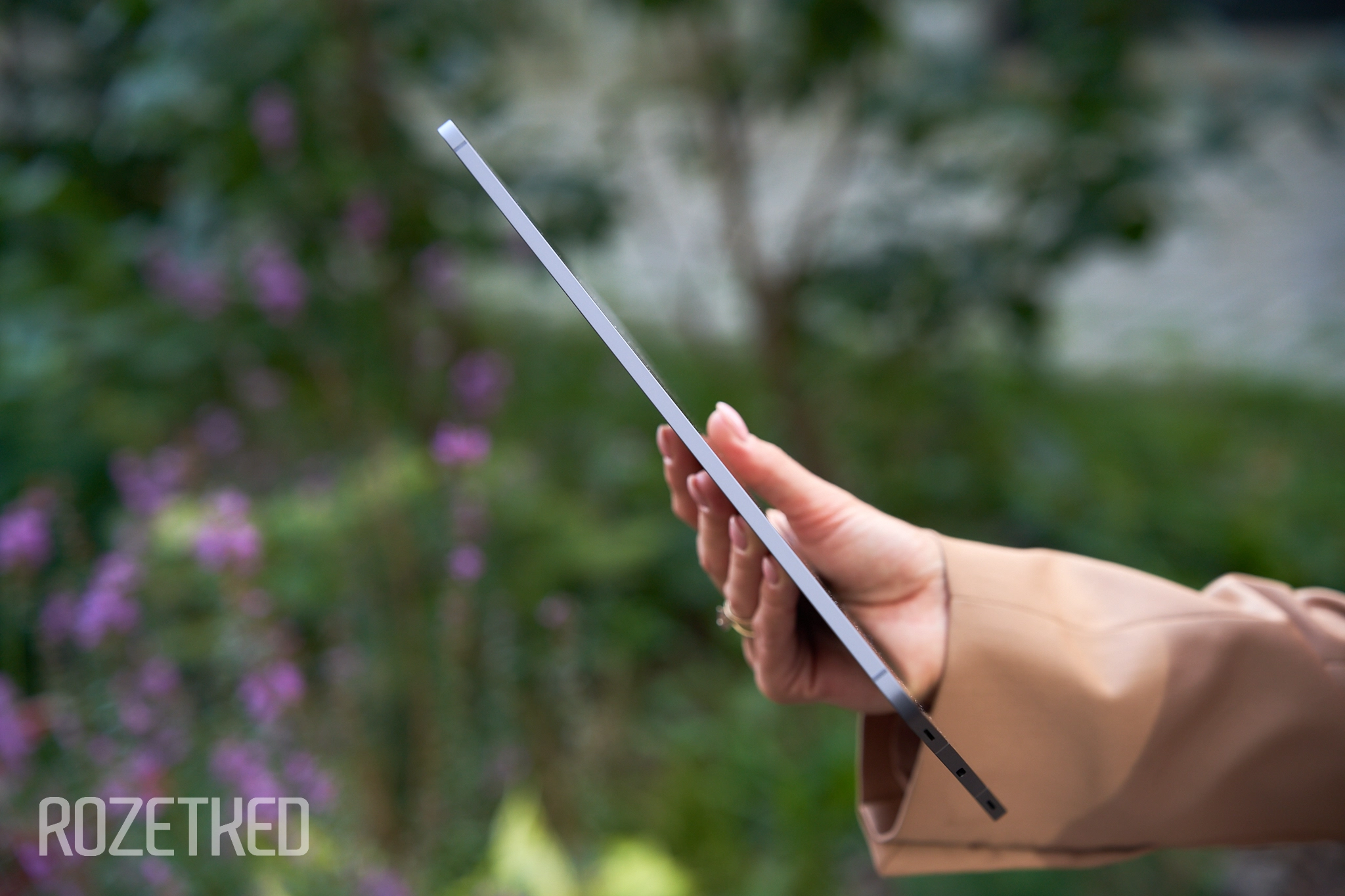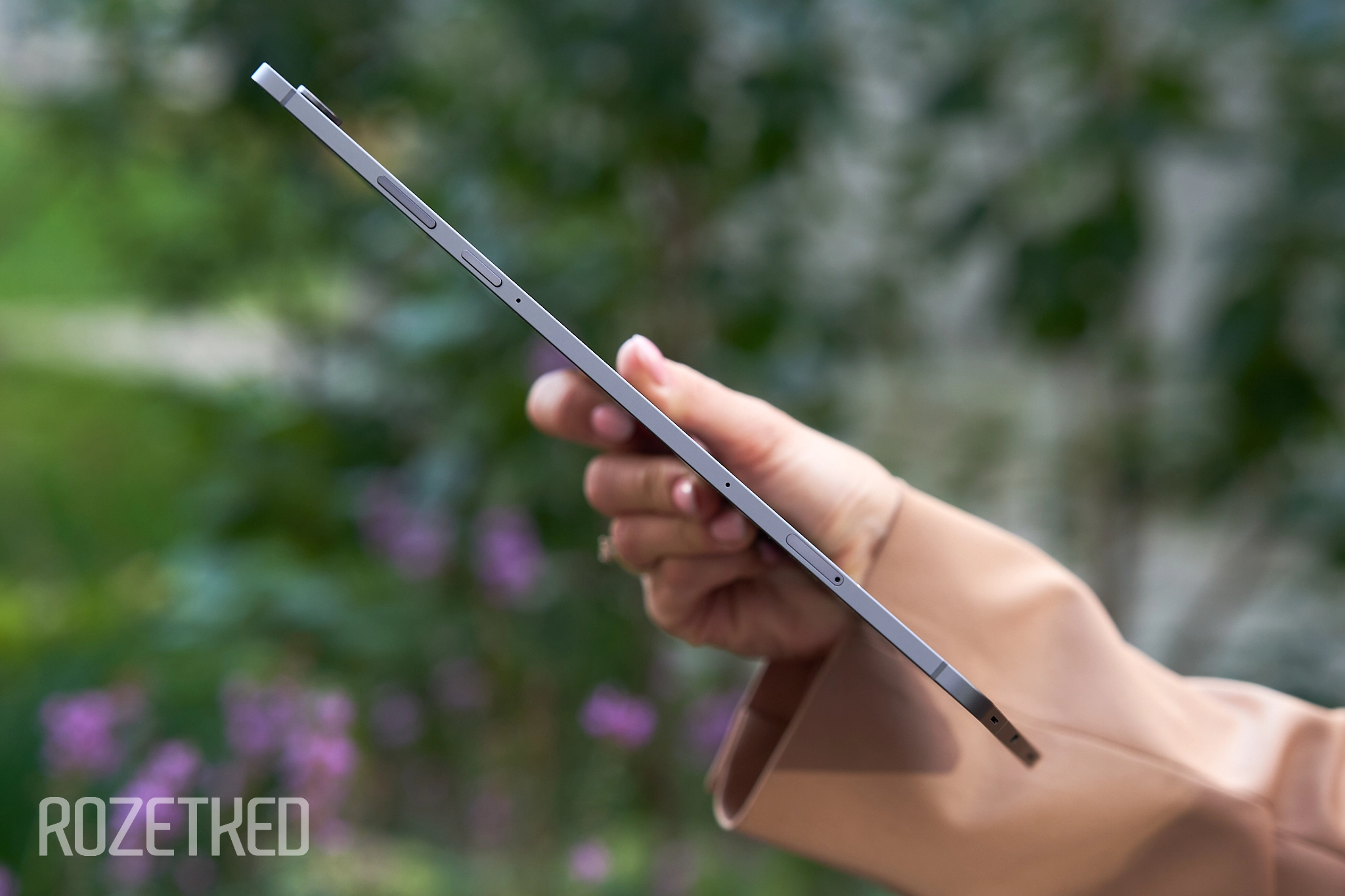 Толщина корпуса всего 5,5 мм, вес тоже небольшой — 469 граммов. У корпуса матовое покрытие, следы и отпечатки на нём почти не заметны. Планшет один из самых тонких на рынке, при этом прочный. Пытался погнуть — не вышло, конструкция монолитная. Держать его удобнее всего двумя руками, одной с ним не управиться в любом случае.