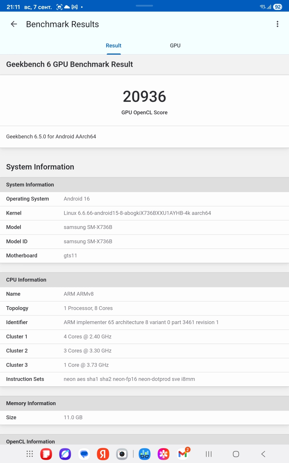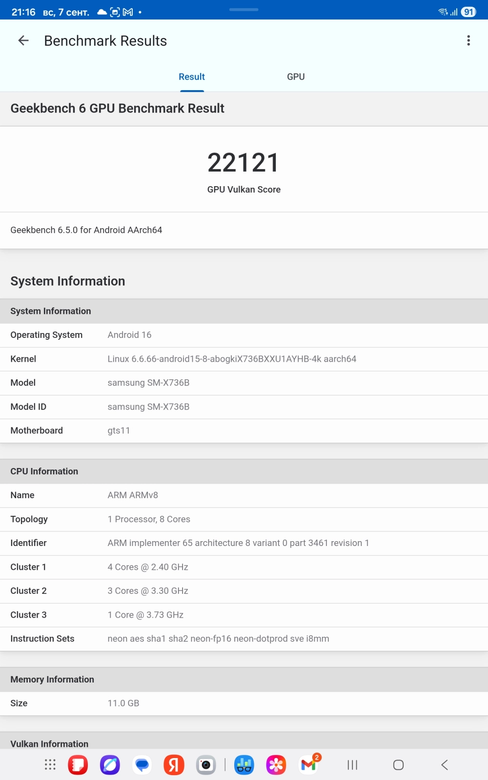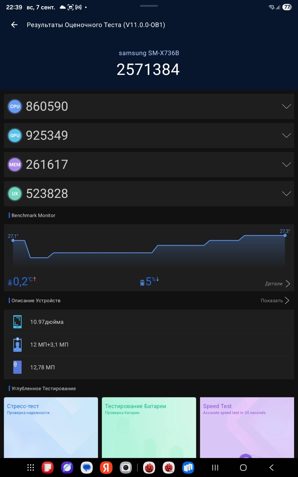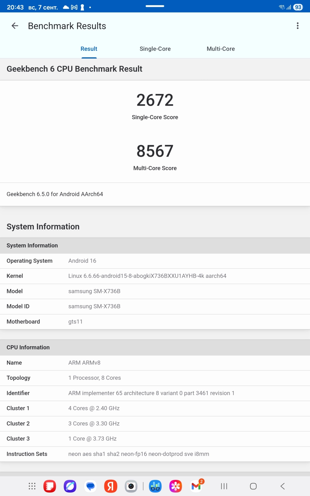 В Samsung Galaxy Tab S11 стоит новый 3-нм чип MediaTek Dimensity 9400+. Samsung говорит, что по сравнению с прошлым поколением процессор быстрее примерно на четверть, графика — почти на сорок процентов. В результате получаем высокие показатели в бенчмарках и плавную работу в реальной жизни.