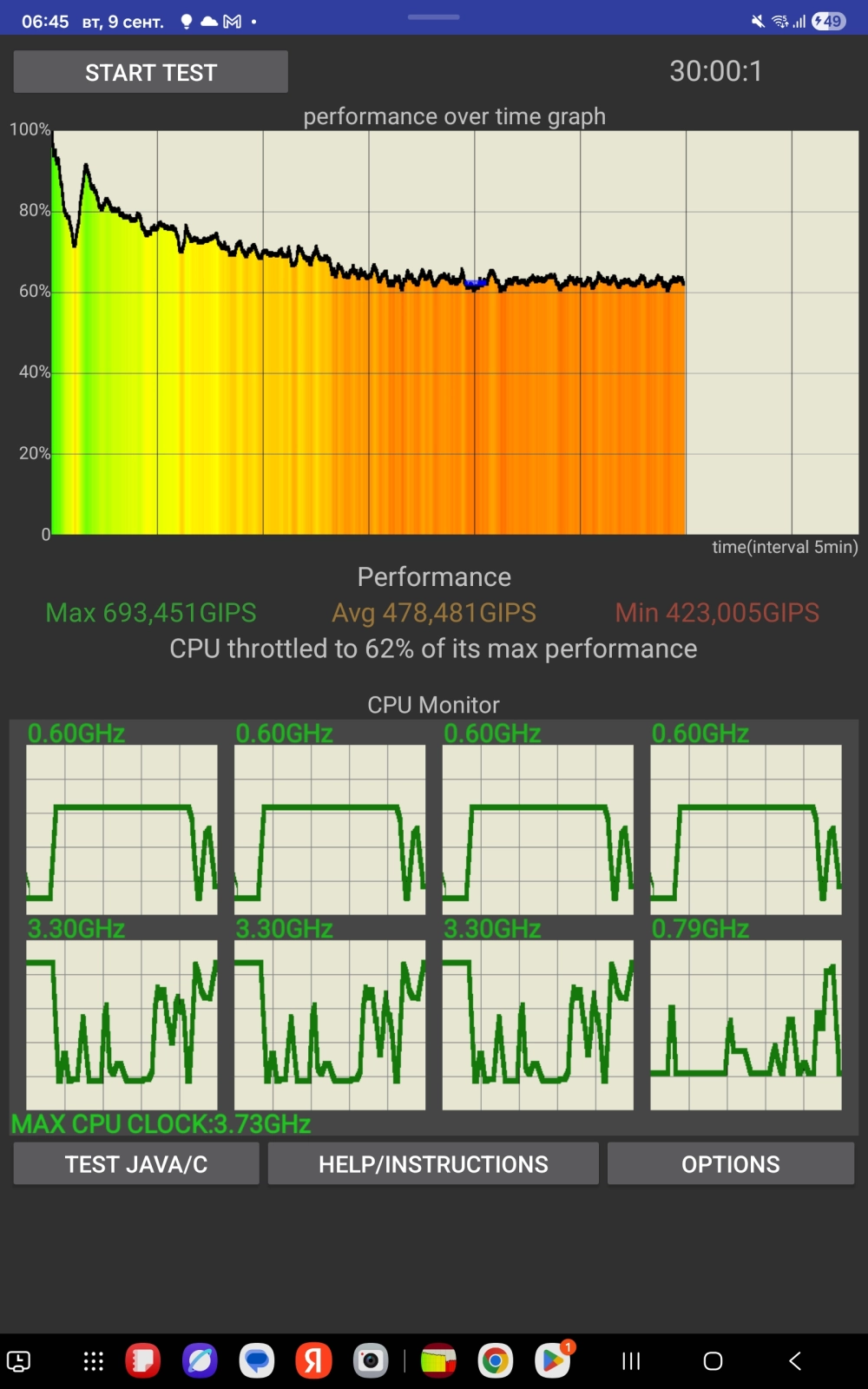 С играми Tab S11 справляется на ура. В PUBG можно смело выкручивать высокие настройки и получать стабильные 60 fps без ощутимых просадок. Нет проблем и с такими требовательными играми, как Genshin Impact или Diablo Immortal. Корпус тонкого планшета становится тёплым, но не перегревается и не понижает частоты — держать комфортно. Избежать троттлинга в стресс-тесте не удалось, просадка заметна, но это именно проблема синтетических измерений, а на деле всё нормально.