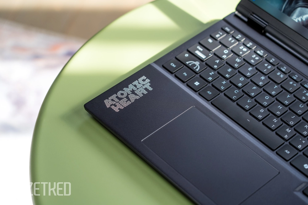 Кастомизация корпуса не закончилась крышкой дисплея: элементы из игры расположены на некоторых клавишах, будь то босс-осьминог или ремшкаф Элеонора. Под клавиатурой также есть отсылки к игре: надпись Atomic Heart расположена слева, в аккурат под запястьем (хочется надеяться, что не затрётся со временем); справа в углу — напоминание о том, что девайс является собственностью Предприятия; и рядом с ними слегка нарушающие эстетику корпуса стикеры от производителей железа и софта.