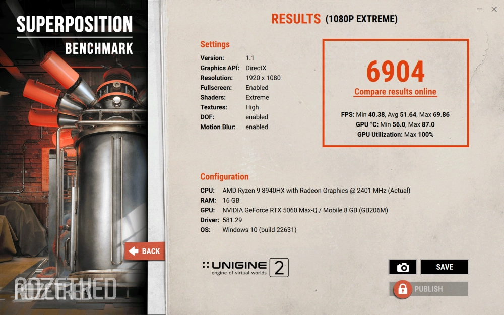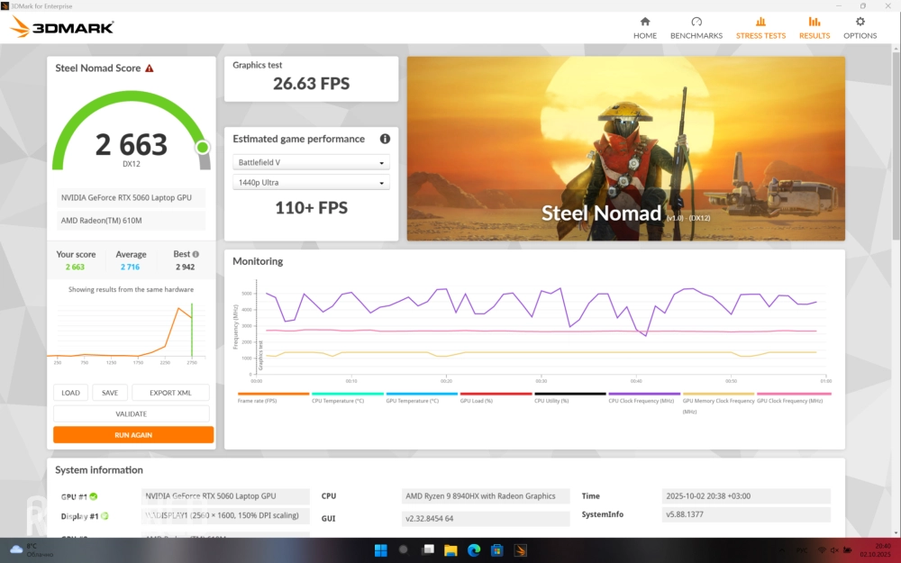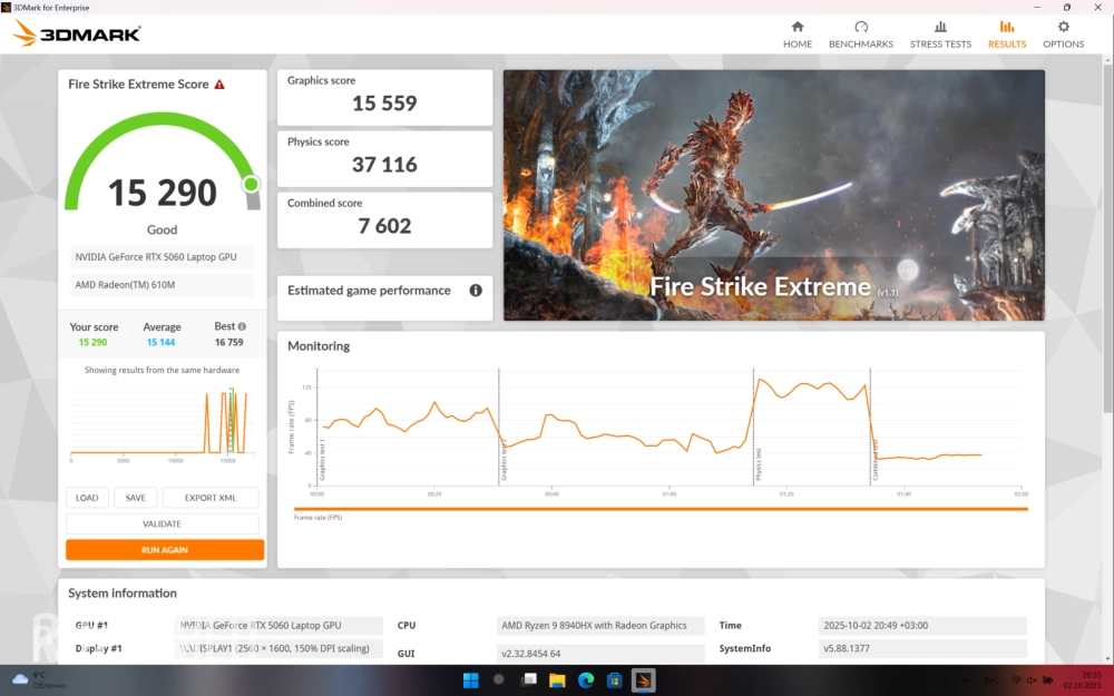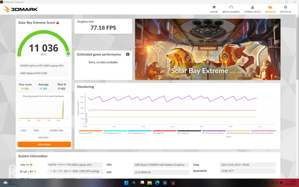 Мобильная Nvidia GeForce RTX 5060 на 8 ГБ отдувается вовсю за поддержание визуального аспекта игр на высоте и, в целом, это у неё получается. Трассировка работает, картинка радует, система вентиляции уверенно справляется, пусть и шумит и нагревает воздух вокруг. Так, в Doom Eternal на высоких настройках с включенным DLSS и RTX показатели fps не падают ниже 120 кадров в секунду.