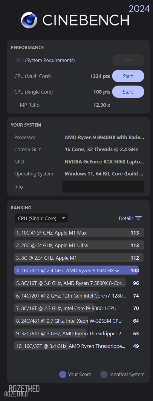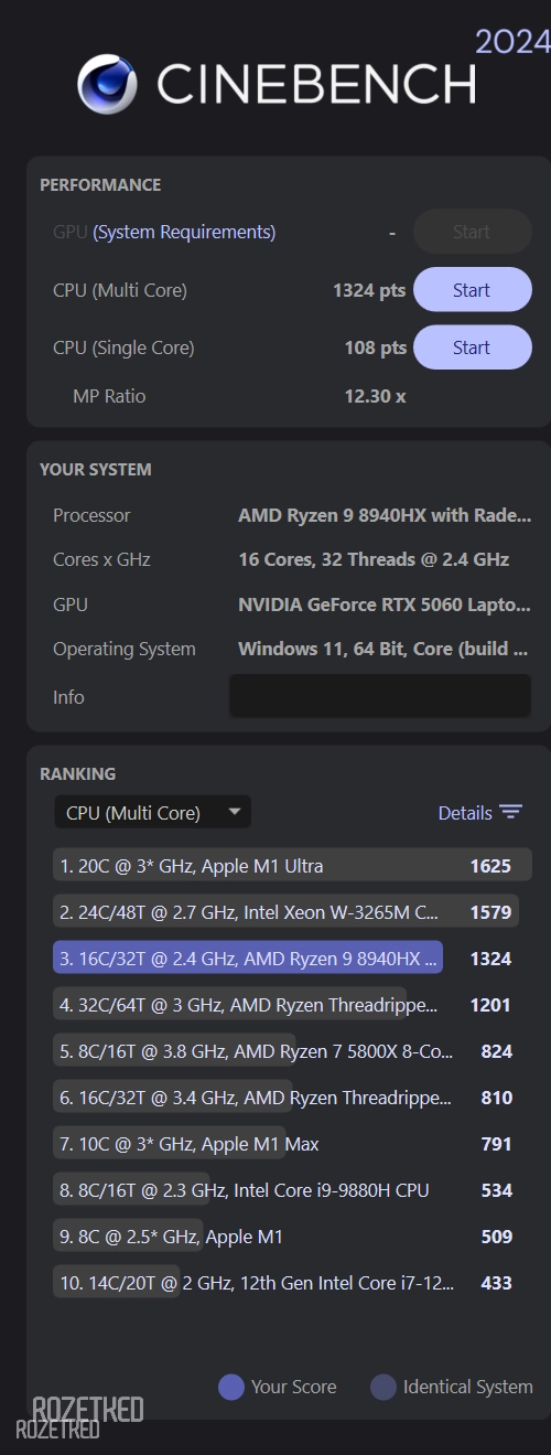 Связка AMD Ryzen 9 8940HX с Nvidia GeForce RTX 5060 не первый раз встречается в ноутбуках и проявляет себя вполне достойно. Процессор был представлен в апреле текущего года и входит в линейку продвинутых мобильных решений Dragon Range, произведённых на основе архитектуры Zen 4 и 5 нм техпроцесса TSMC.