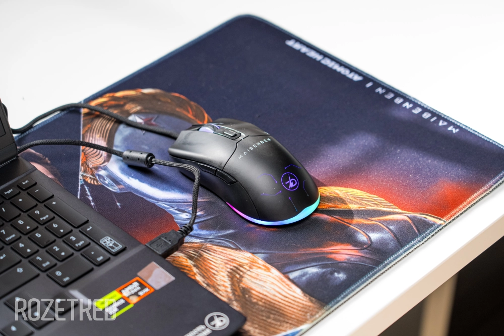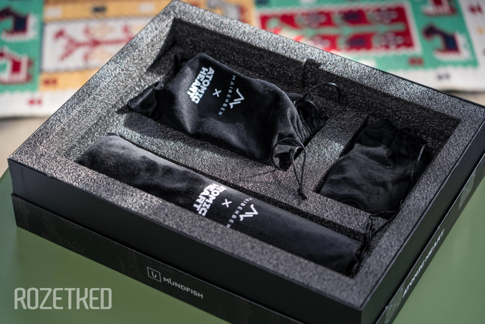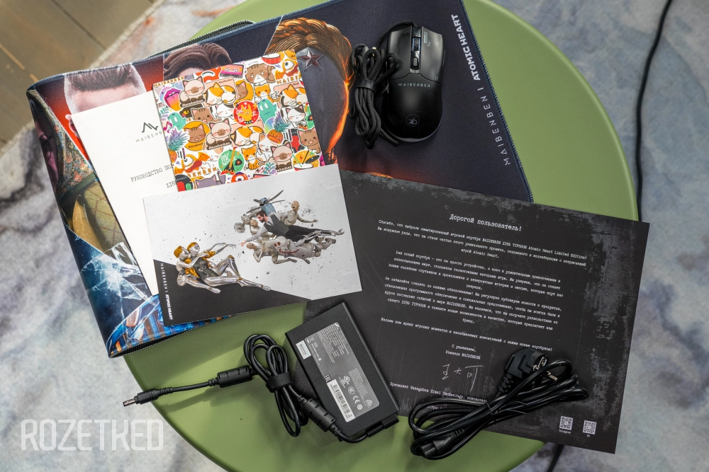 Maibenben X-Treme Typhoon X16B поставляется в комплекте с ковриком, на котором изображены главные персонажи Atomic Heart, и проводной мышью Maibenben GM301, получившей подсвечиваемую RGB-подсветкой эмблему Предприятия 3826. Оба аксессуара красиво упакованы в мешочки с логотипами Atomic Heart и Maibenben.