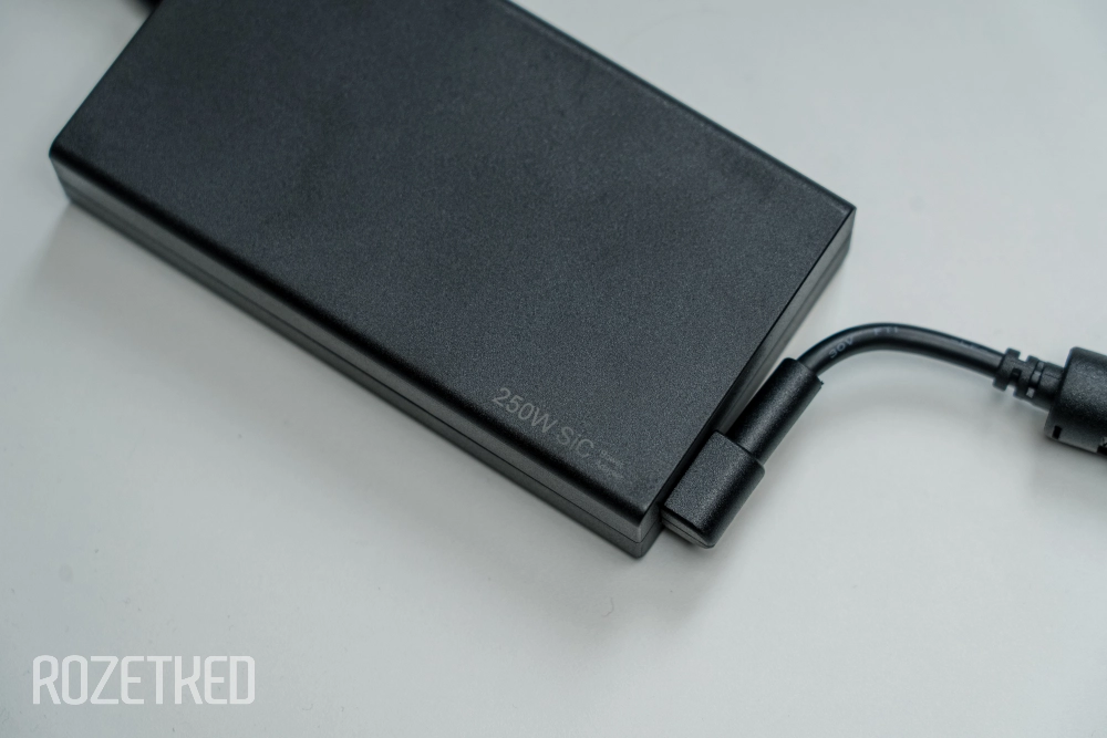 Помимо брендированных аксессуаров, в комплекте идёт совершенно обычный с точки зрения дизайна адаптер питания 5,5 мм на 250 Вт — не самый большой, но увесистый. Именно он отвечает за питание, хотя, казалось бы, разъём Type-C сзади намекает на возможность заряжать ноутбук обычным адаптером в офисном режиме. Увы, зарядка даже с адаптером на 120 Вт доступна только медленная и при выключенном устройстве.