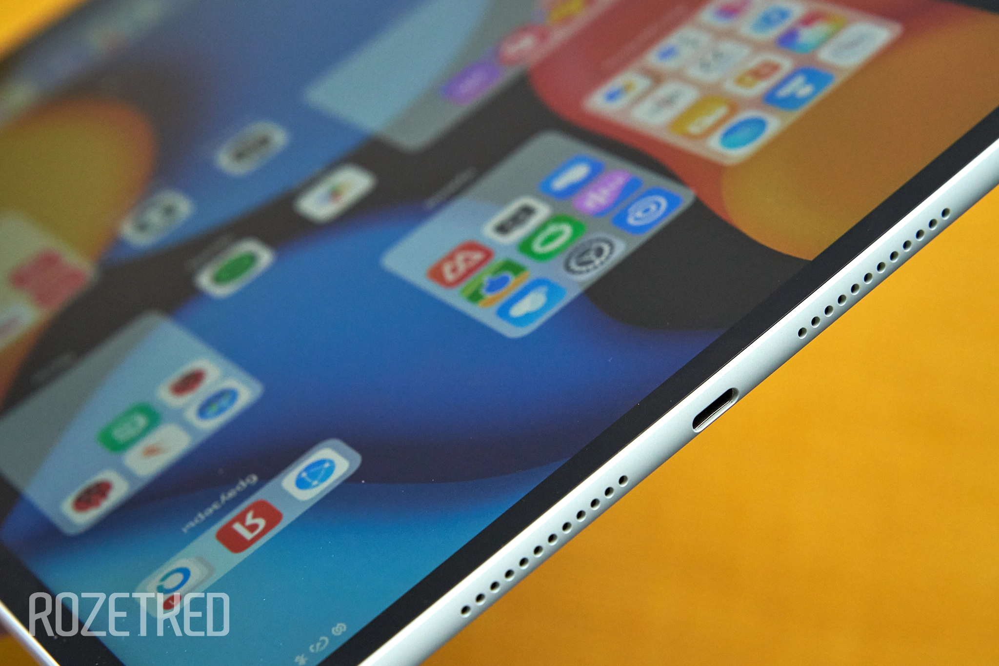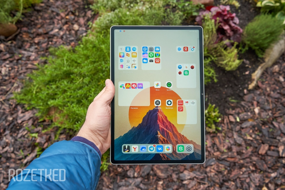 Рамки вокруг экрана тонкие, но эргономика не страдает — планшет удобно держать без случайных касаний дисплея. Фронтальная камера аккуратно вписана, симметрия сохранена, всё выглядит гармонично. Кнопки с минимальным ходом расположены на привычных местах, порт USB-C по центру. Шесть решёток динамиков аккуратно встроены в корпус по периметру, создавая ощущение звука «вокруг».