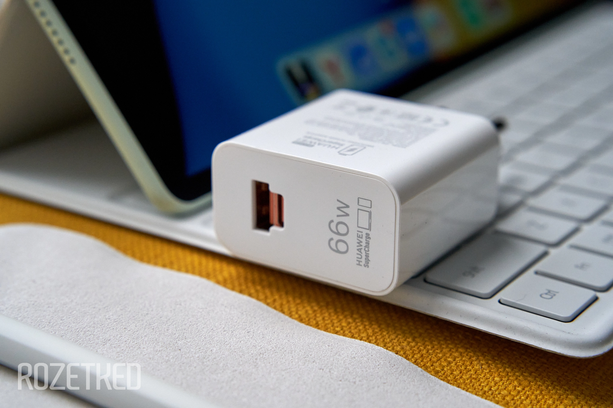 В комплекте идёт адаптер SuperCharge на 66 Вт с двумя разъёмами, можно подключать кабель с USB-A или USB-C.