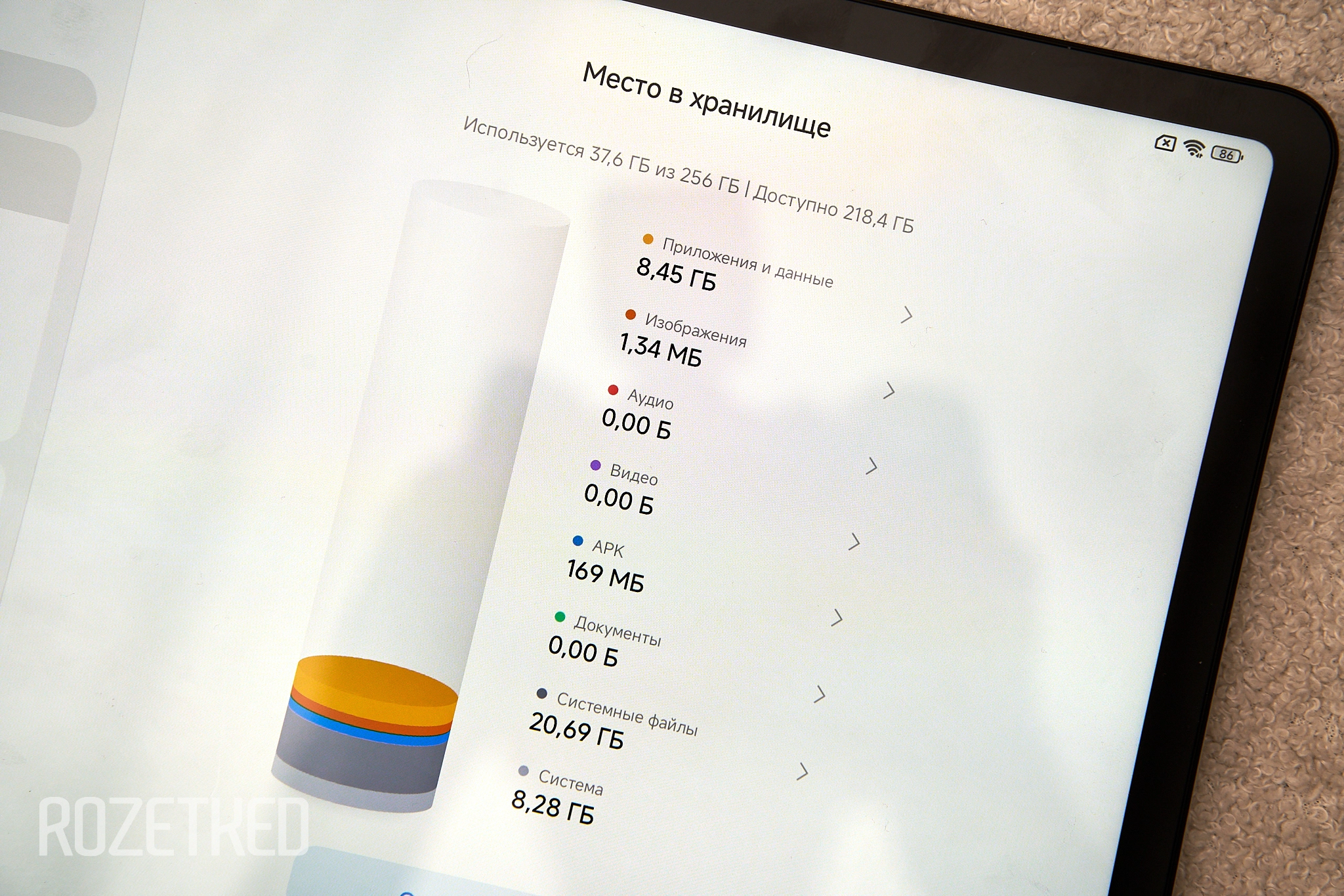У планшета может быть 6 или 8 ГБ оперативной памяти LPDDR4X и 128 или 256 ГБ встроенной типа UFS 2.2. Ещё имеется слот для карты памяти microSD (она может быть до 2 ТБ). Карта памяти в наше время редкое явление, поэтому запишу эту особенность в плюсы.