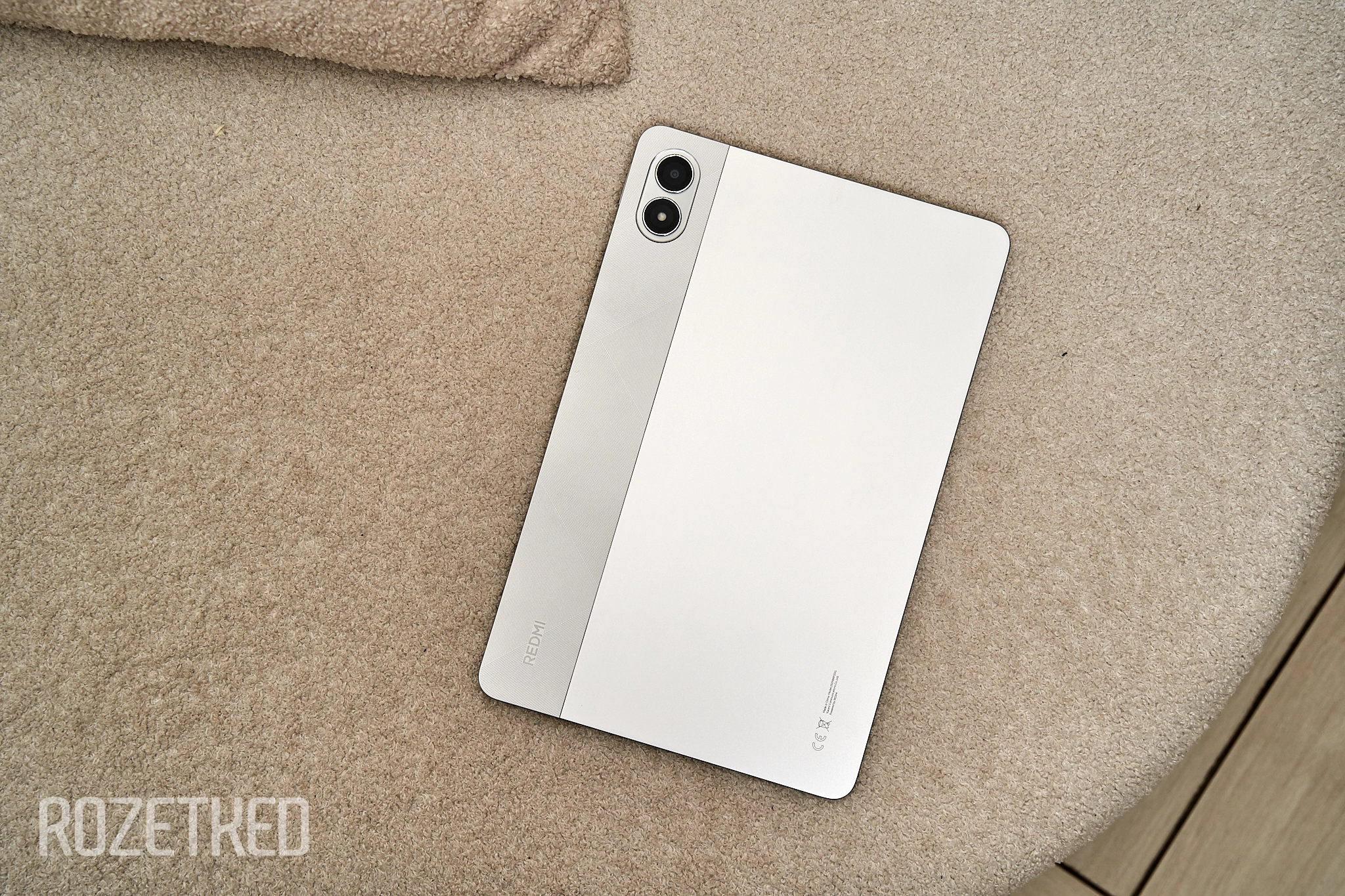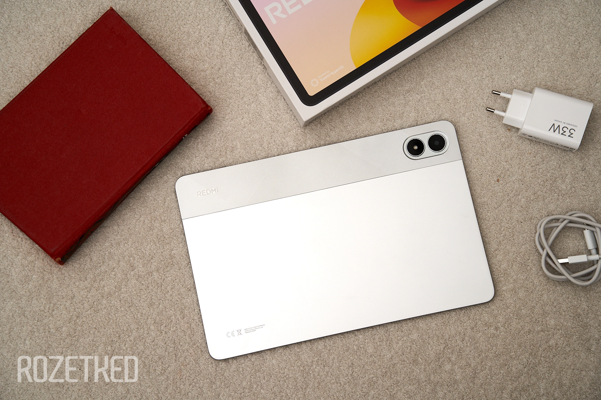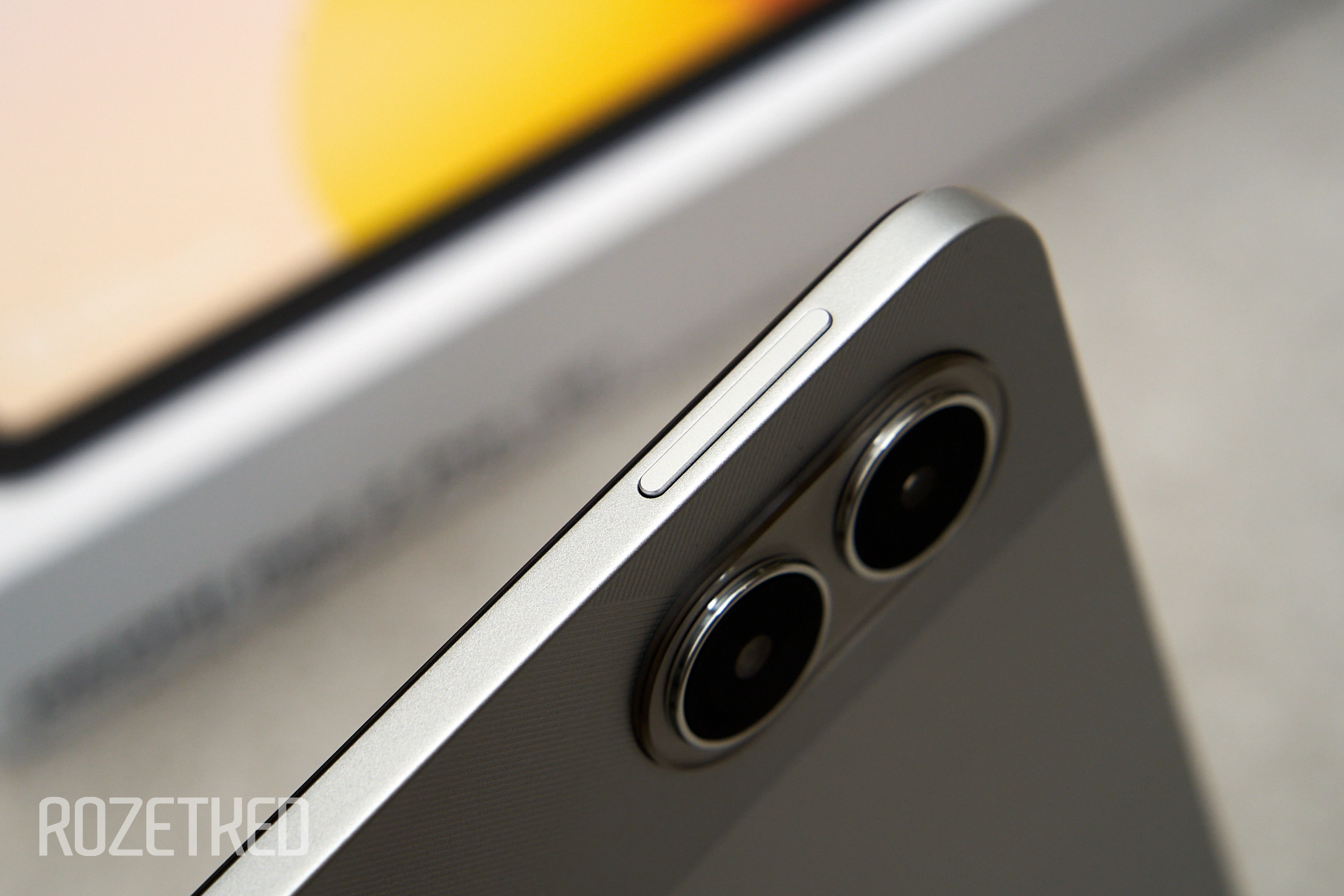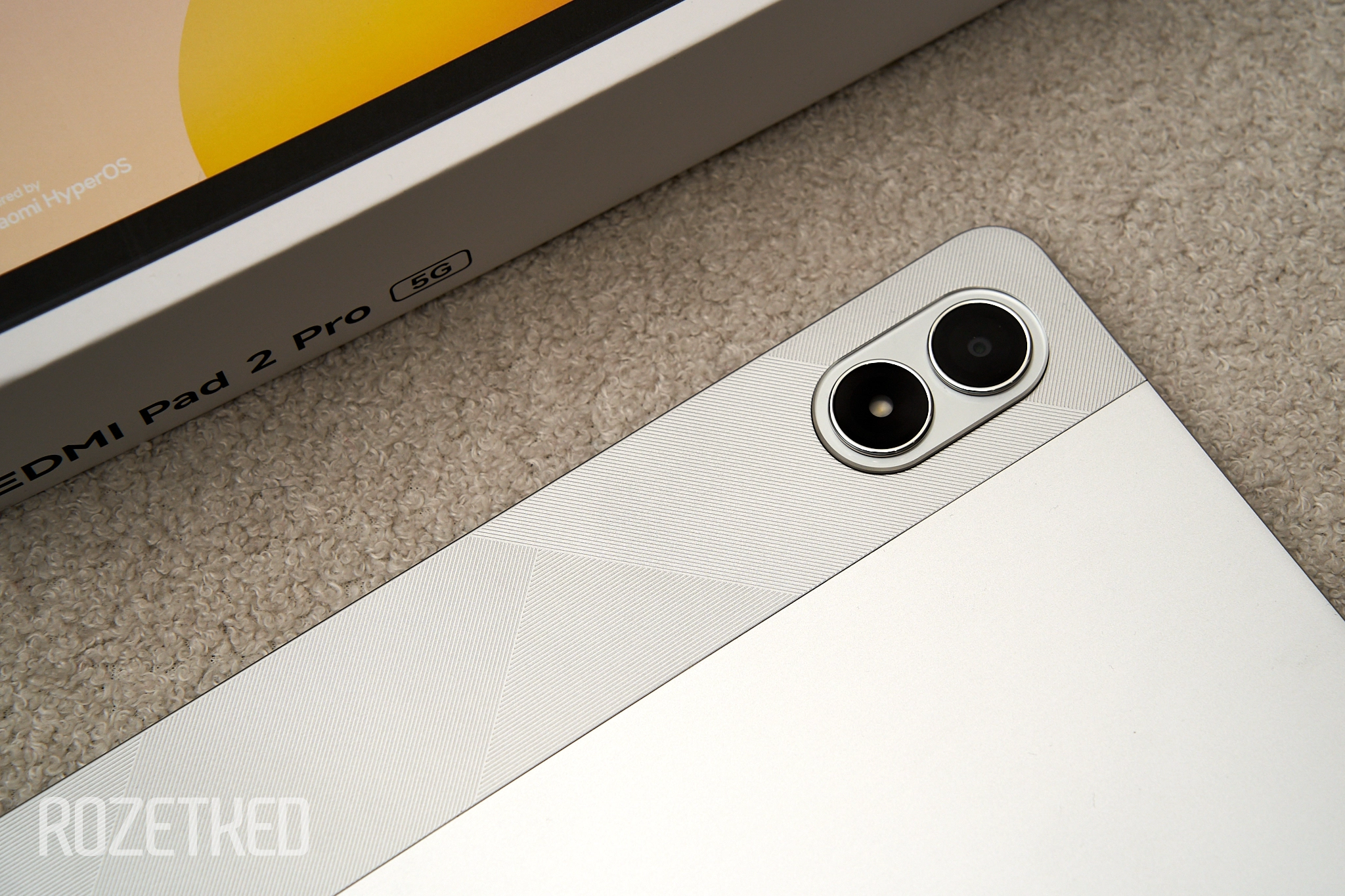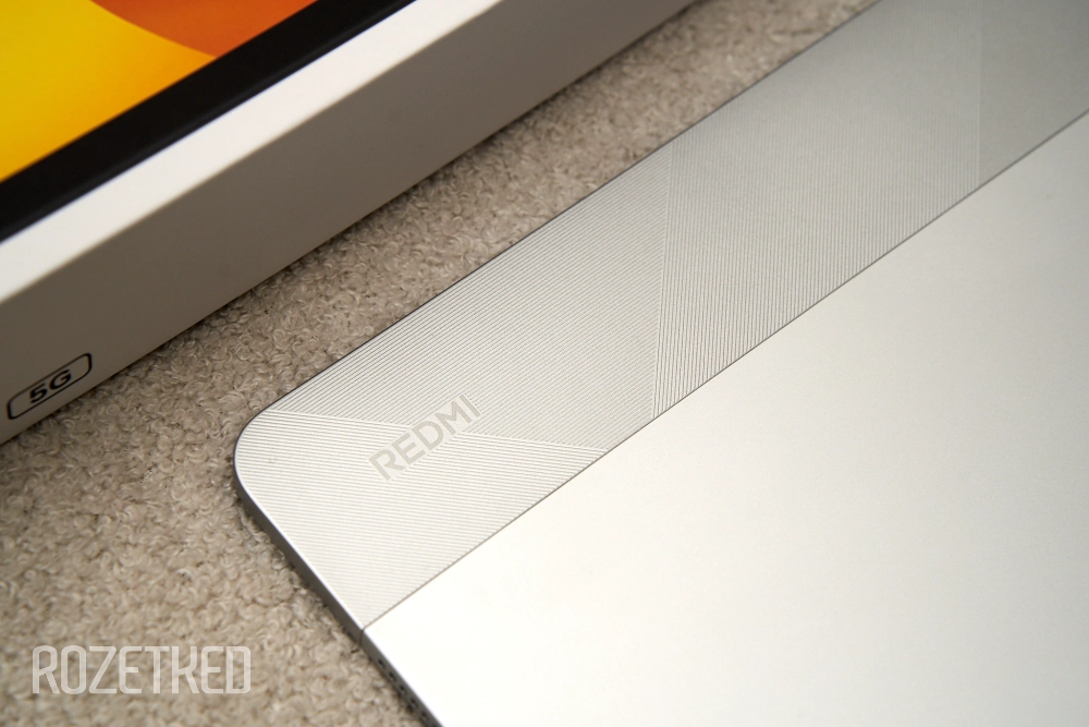 Часть задней панели занимает пластиковая вставка с рифлёным рисунком. Думаю, она тут не просто для красоты, а для более устойчивой работы связи. На серебристой поверхности заметны отпечатки, но их легко удалить тряпочкой. Также Xiaomi Redmi Pad 2 Pro 5G бывает и в тёмно-сером цвете.