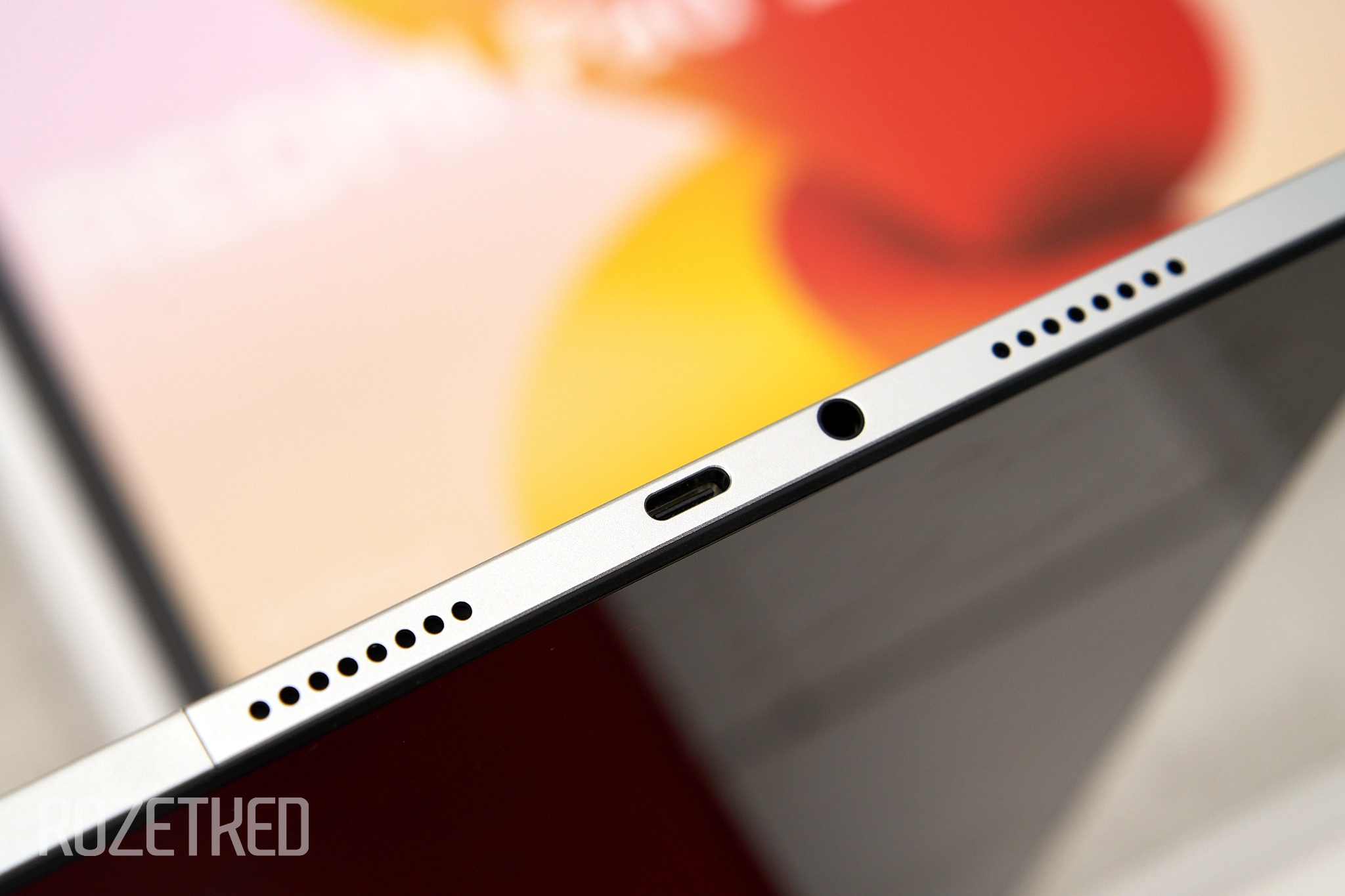 У планшета две пары динамиков, которые расположены по бокам, но про звук чуть позже. На нижнем торце можно найти USB-C для зарядки и уже позабытый 3,5-мм разъём под наушники. Они расположены не симметрично, для эстетов это больной факт. Боковые поверхности плоские, изгибов и закруглений на них нет, но в ладони ничего не впивается и неприятных ощущений нет.
