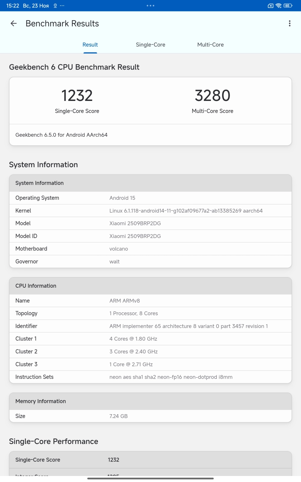 Начинка достойная, но не топовая, зато современная. У планшета 4-нм чипсет Snapdragon 7s Gen 4 со знакомой архитектурой 1+3+4. У него одно производительное ядро Cortex-A720 с частотой 2,5 ГГц, три ядра Cortex-A720 на частоте 2,4 ГГц и четыре энергоэффективных Cortex-A520 с 1,8 ГГц. За графику отвечает ускоритель Adreno 810.