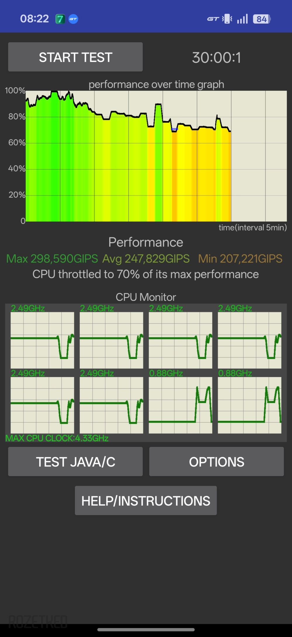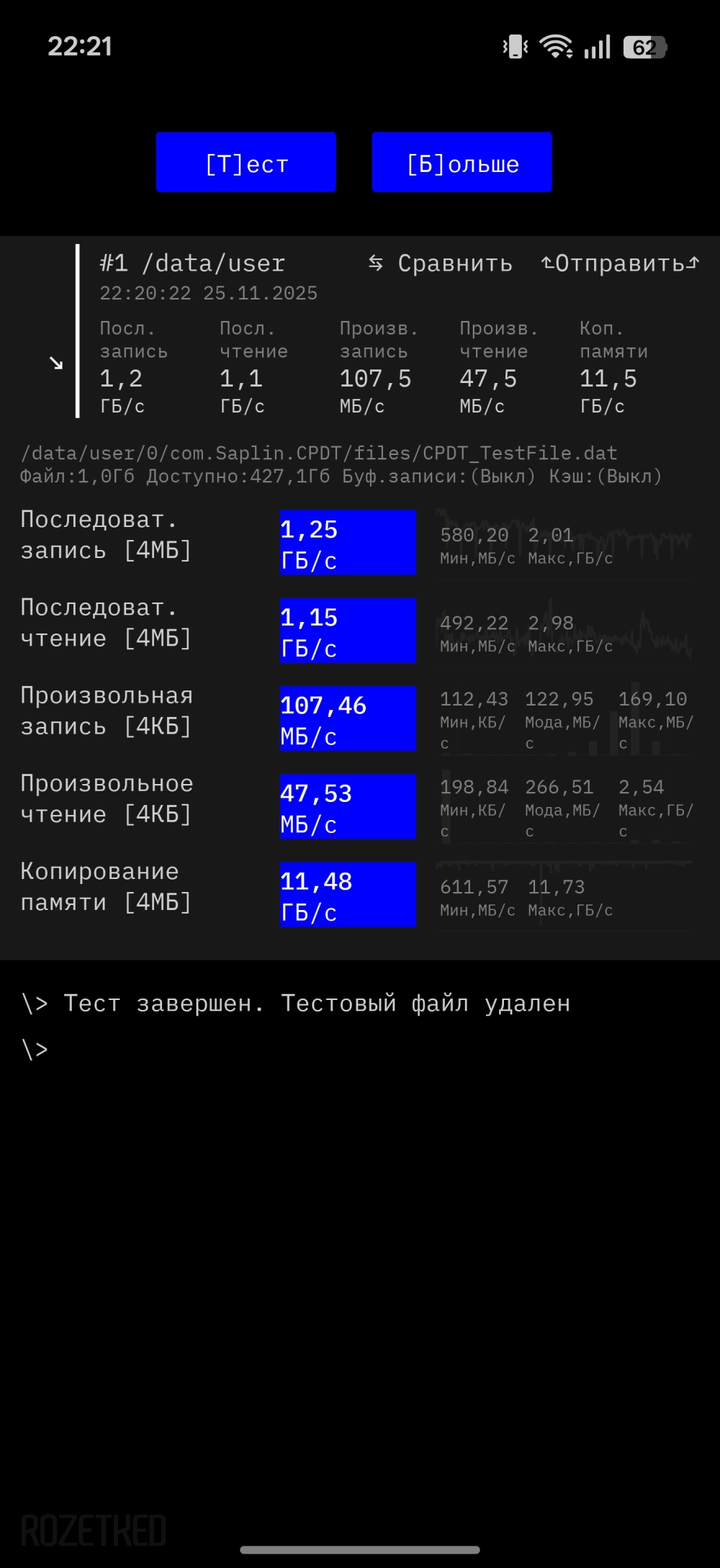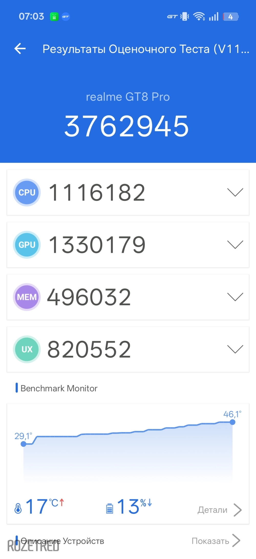 К чести realme GT 8 Pro можно сказать, что такое случилось лишь единожды: запустил не самый популярный троттлинг-тест и после десяти минут смартфон пожаловался на перегрев и свернул приложение, при этом нагревшись в пике до 57 градусов. Зато в более-менее известном тесте смартфон честно продержался все 30 минут. Успех можно считать переменным — всё же были просадки примерно до 70%, корпус был не горячим, но ощутимо тёплым. В играх присутствовал умеренный нагрев корпуса и не было ни единого намёка на подтормаживания.