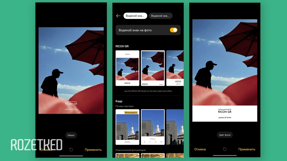Основной объектив улучшили софтово, добавив специализированные режимы съёмки и фильтры, созданные совместно с Ricoh. Эта японская компания выпускает множество устройств, в том числе фото- и видеокамеры. Коллаборация с realme выразилась в выделенном режиме съёмки, фокусе на уличной съёмке: выделенный режим вдохновлён камерой Ricoh GR и позволяет быстро снять нужный уличный пейзаж, быстро выбрав необходимое фокусное расстояние.