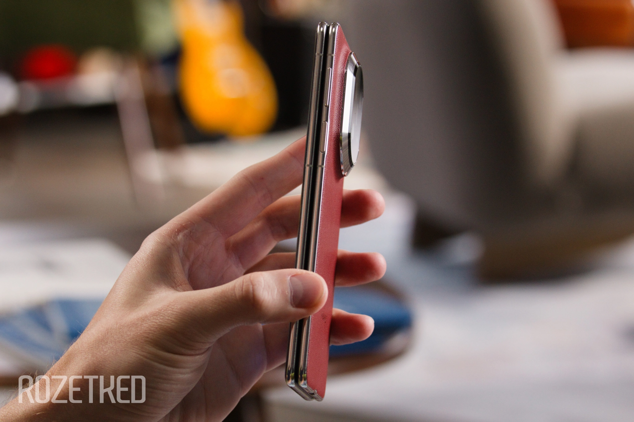 В разложенном состоянии Mate X7 трансформируется в миниатюрный планшет с 8‑дюймовым дисплеем (2210×2416 пикселей, 120 Гц, LTPO OLED). Это немного больше, чем было в Mate X6. Выраженной складки в зоне шарнира не наблюдается, но под углами её заметно. Но не вижу в этом ничего критичного. Защитные пластиковые бортики вокруг экрана снижают риск повреждений при случайных ударах и соприкосновениях половинок.