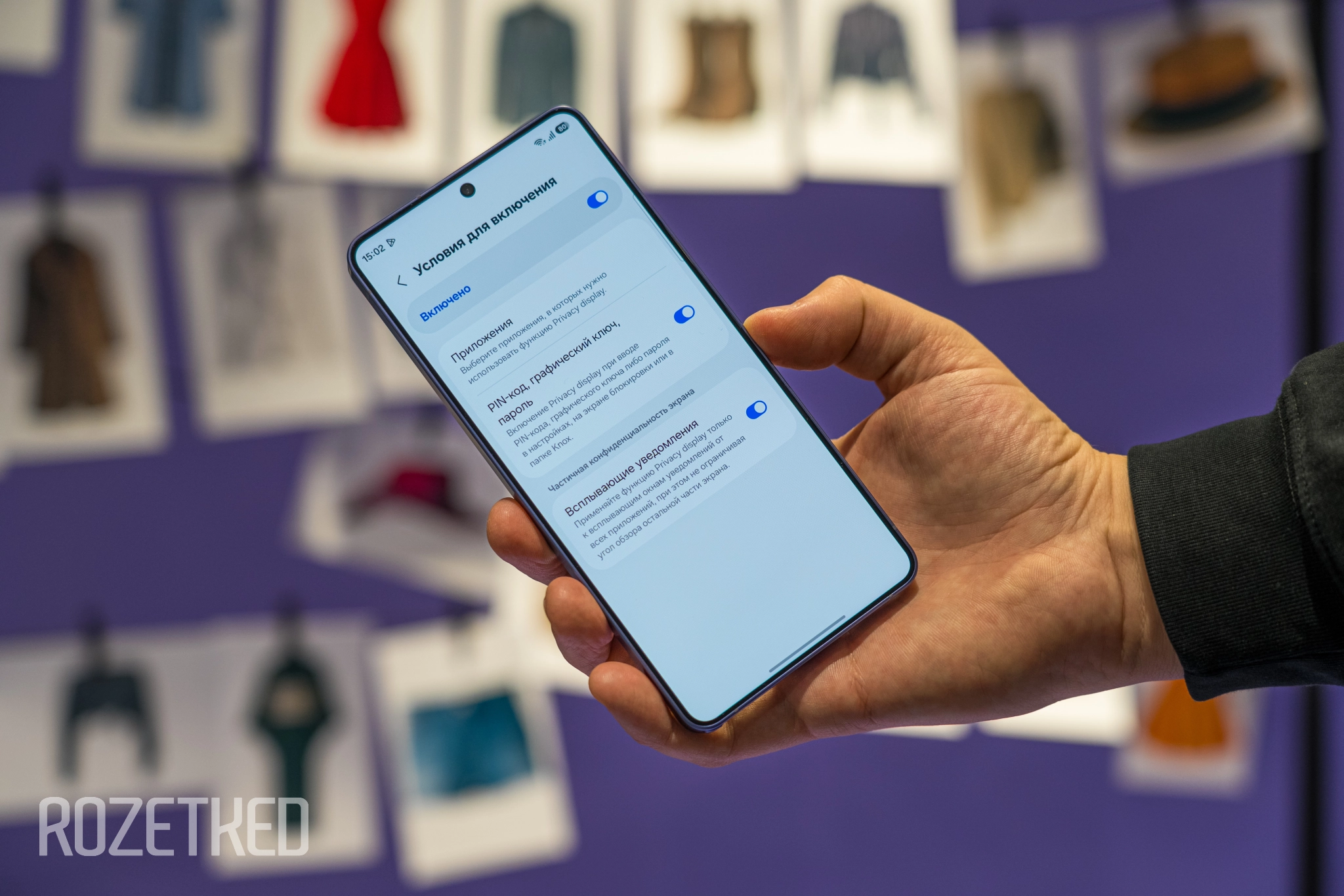 От всяких антишпионских плёнок Privacy Display отличается тем, что режим можно настроить под себя: например, чтобы он включался автоматически для уведомлений, при вводе PIN-кодов и паролей или запуске определённых приложений — всё это выбирается в «Настройках». Так намного удобнее: спрятать от посторонних только поле, где вводится пароль, а не весь экран, как в случае с плёнками.