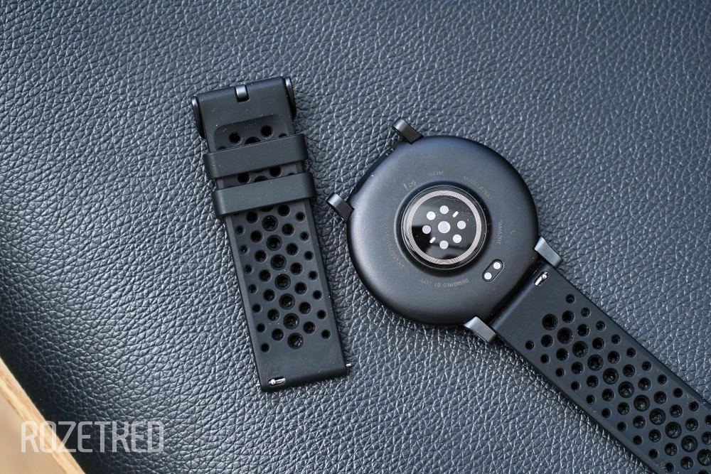 У часов силиконовый перфорированный ремешок, у которого отличная вентиляция, так что рука не потеет. Удобно, что это стандартное 22 мм крепление, поэтому его при желании можно легко заменить на любой совместимый — кожаный или нейлоновый. Цвет ремешка под чёрный корпус ожидаемо чёрный — всё по канонам.