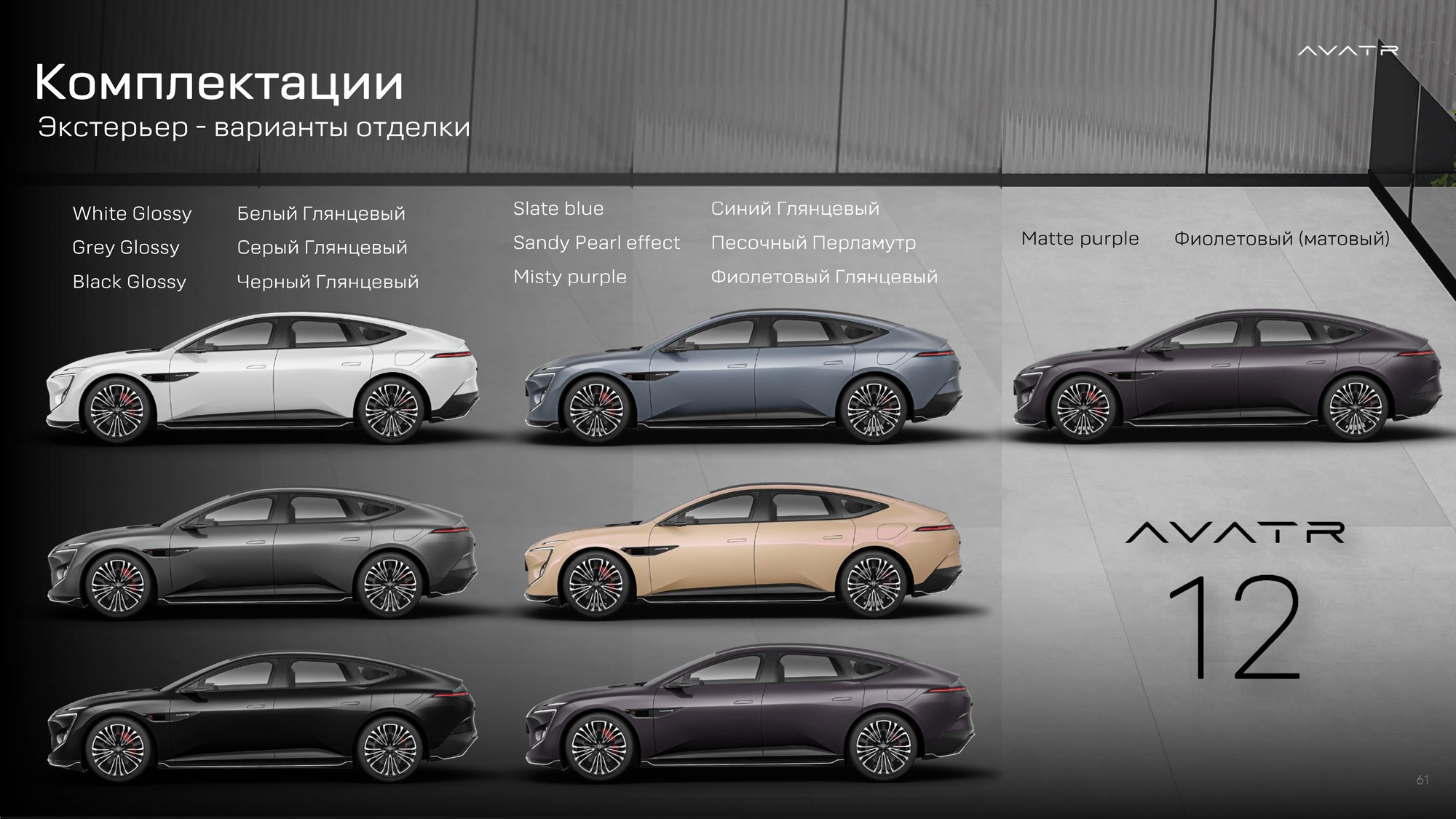 Avatr 12 доступен в семи цветовых исполнениях, мой фаворит — перламутр (к сожалению, на тесте его не было). Либо матовый фиолетовый — дорого и практично. Вариантов отделки три: от классической чёрной до синей и бело-фиолетовой. Ценник официальный — бодрый: от 6,9 до 8,2 млн рублей. Стоит ли говорить, что это авто для тех, у кого нет проблем с финансами и кому не нужен огромный LiXiang?