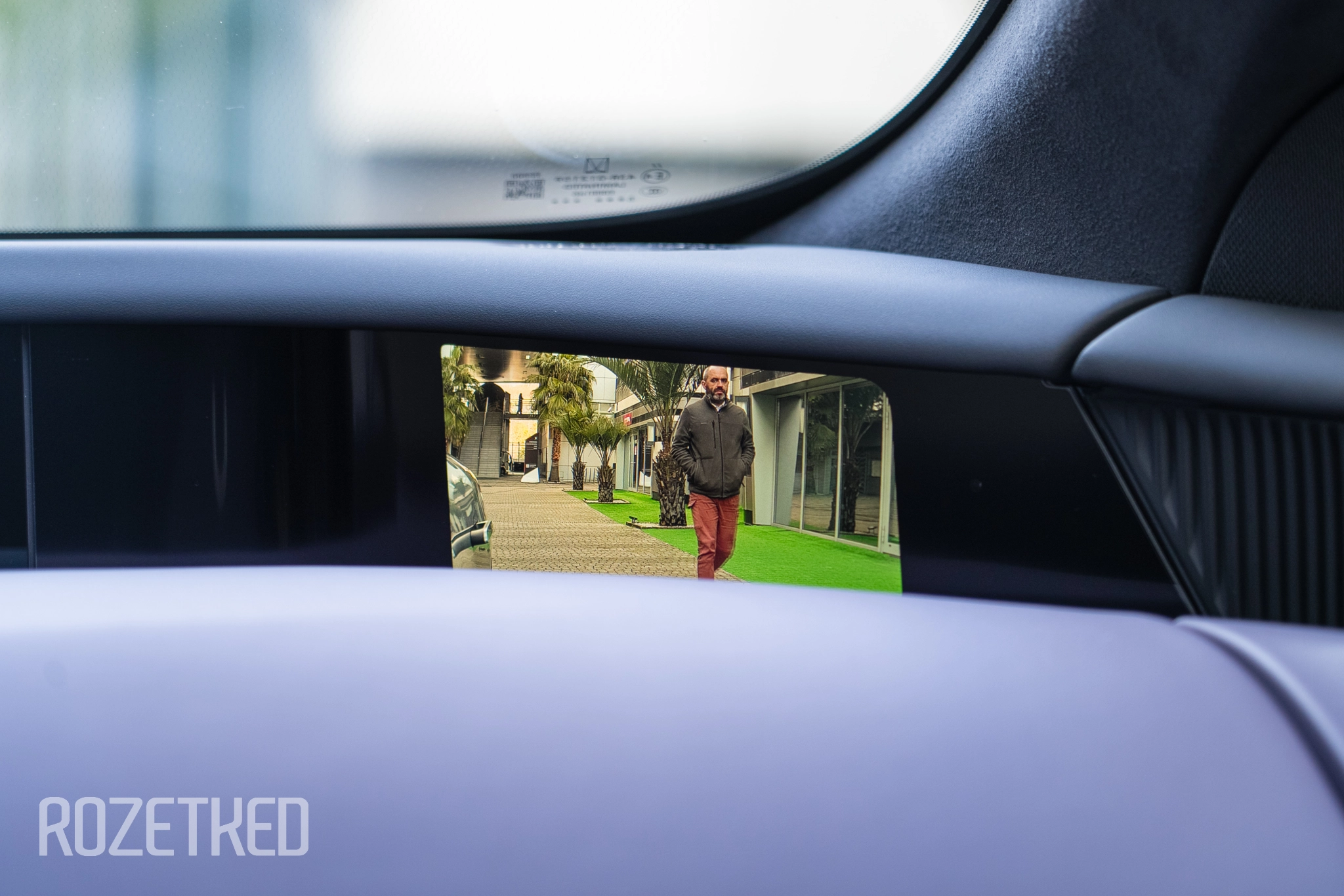 А теперь к самому необычному — боковым зеркалам. В комплектации Dynamic Pro вместо привычных зеркал стоят камеры. Картинка выводится на экраны по бокам. Согласно официальным данным, с ними вы видите на 50% больше, чем с привычными зеркалами; линза имеет гидрофобное покрытие и защищена от запотевания.