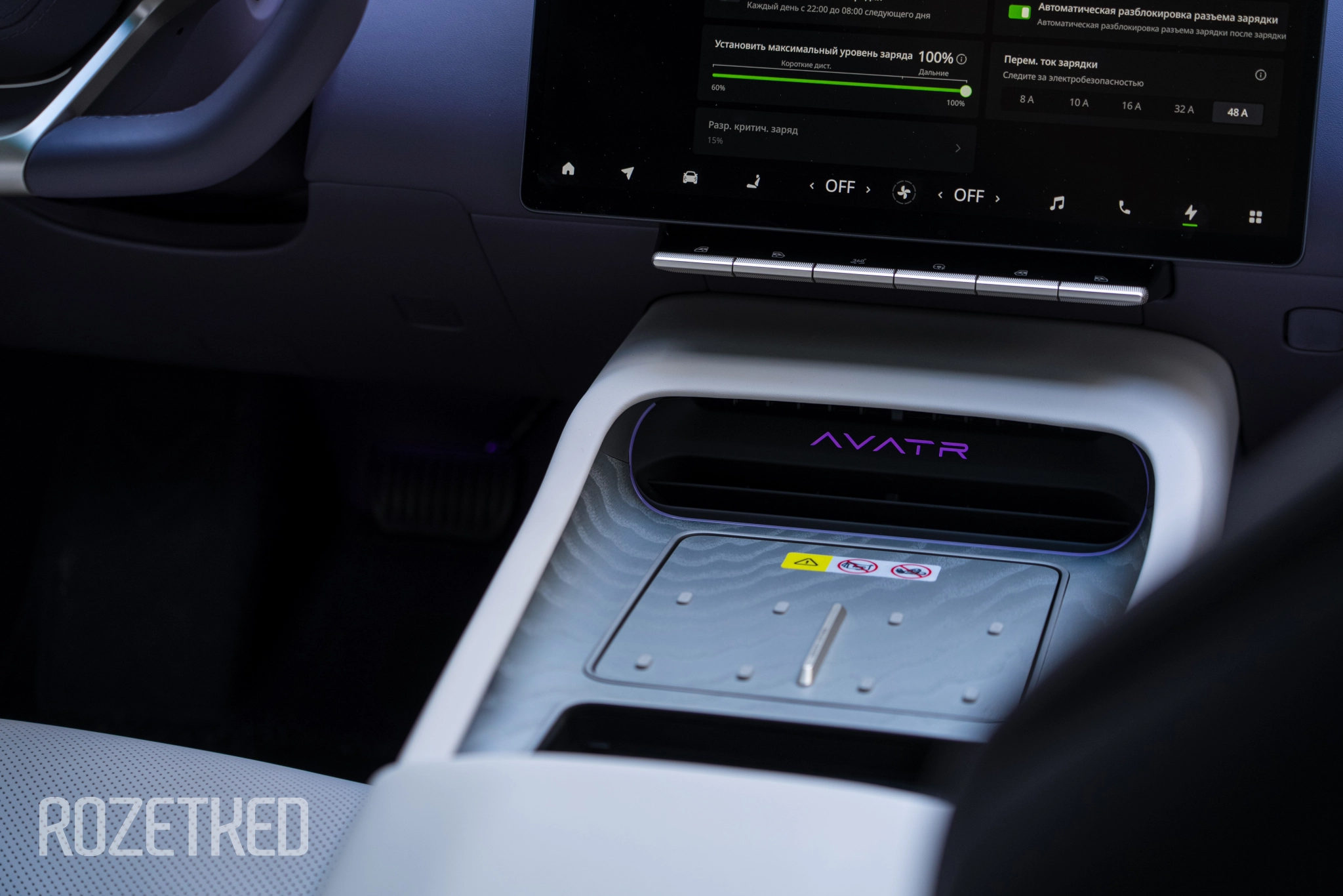 В центральной консоли используется древесина, как раз в том месте, куда нужно класть телефоны для зарядки. Мощность беспроводной зарядки достигает 50 Вт, есть автоматическое охлаждение телефонов. Над консолью есть единственные кнопки управления с неожиданной функциональностью: открытие окон, камеры 360 и автопаркинг. «Аварийка» имеется отдельно — находится в отсеке наверху.