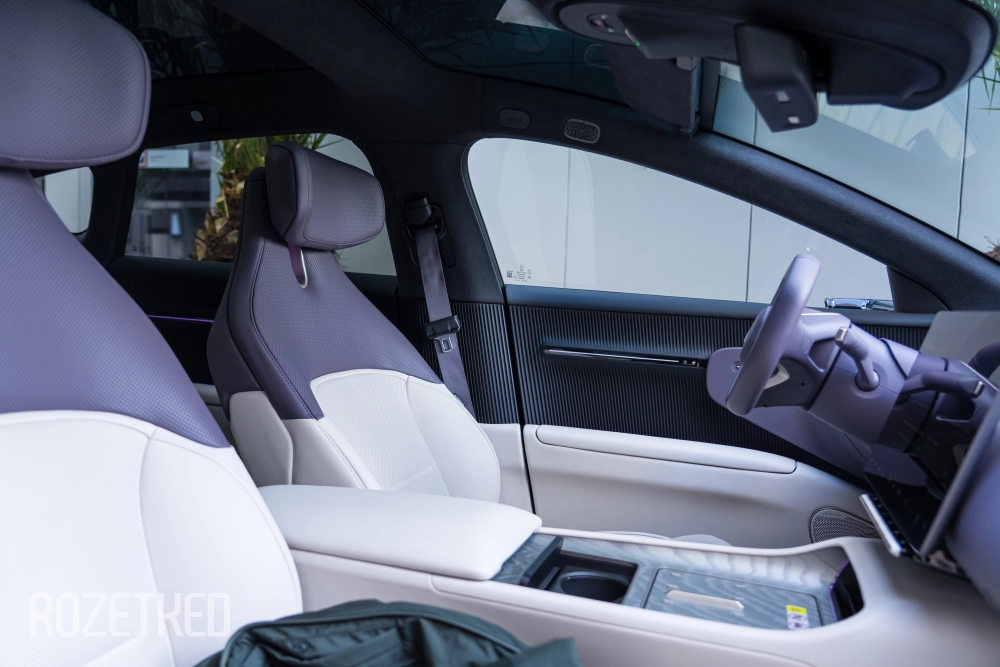 Материалы салона — исключительно премиальные. Отделка руля и салона кожей Nappa, наверху алькантара, но про панораму не забыли: тут отдельно люк для переднего ряда, а для заднего большая крыша с затемнением и защитой от ультрафиолета. Если вдруг вы не фанат панорам, можно докупить аксессуар и всё закрыть (часто встречал подобные решения в китайских такси).