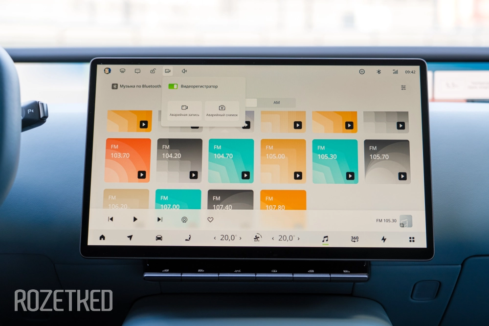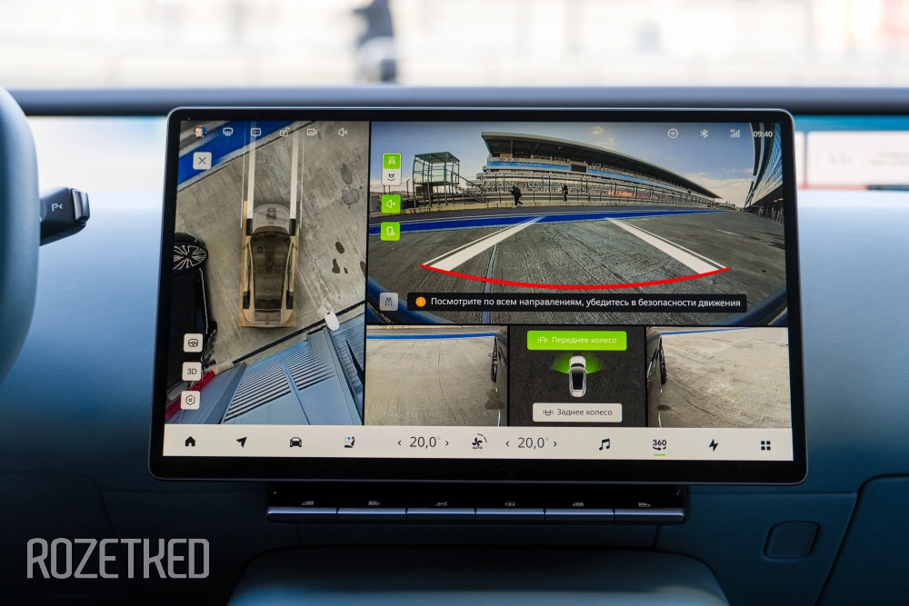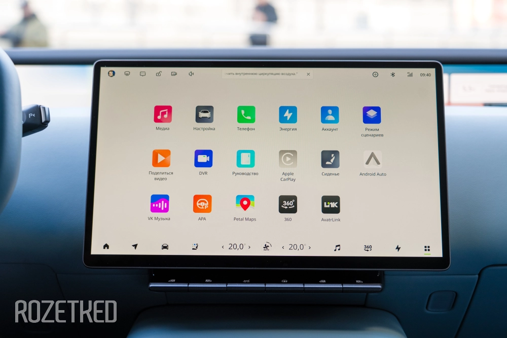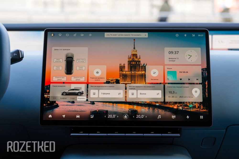 Помимо этого, по центру установлен 15,6-дюймовый 2К-дисплей; система также настроена под формат виджетов, чтобы вы кастомизировали всё под себя. С переводом проблем не замечено. Внутри мощный процессор Snapdragon 8155, система совсем не тормозит, работает всё плавно.
