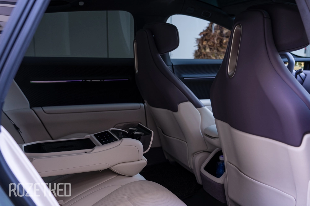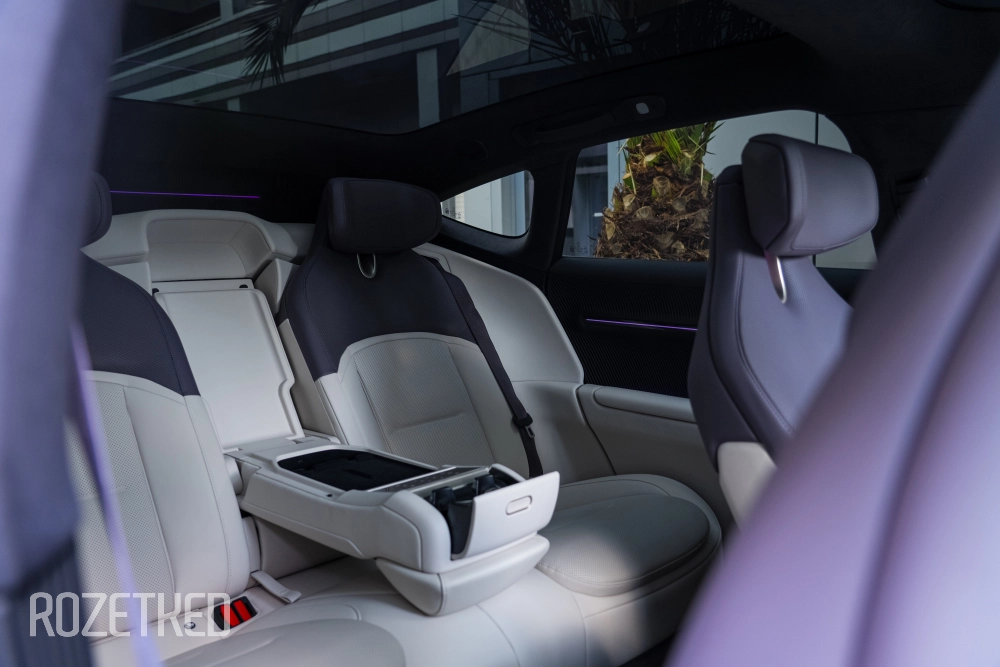 Сзади тоже всё комфортно. Понятное дело, что туда могут влезть и три человека, но комфортнее будем двум, учитывая удлинённый центральный подлокотник и массаж с подогревом. Если вам мешает сиденье переднего пассажира, его легко можно сдвинуть сзади — отдельные кнопки под это предусмотрены. В общем, Avatr легко можно назвать бизнес-авто, ведь на заднем сиденье достаточно много места, разве что столиков откидных не хватает.
