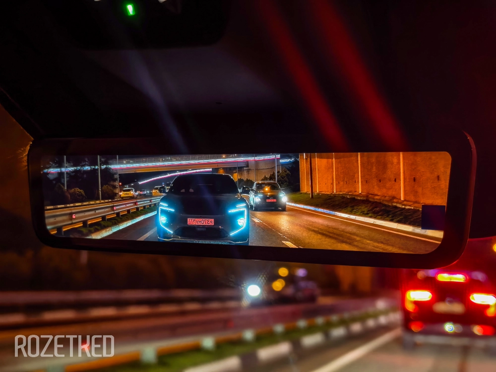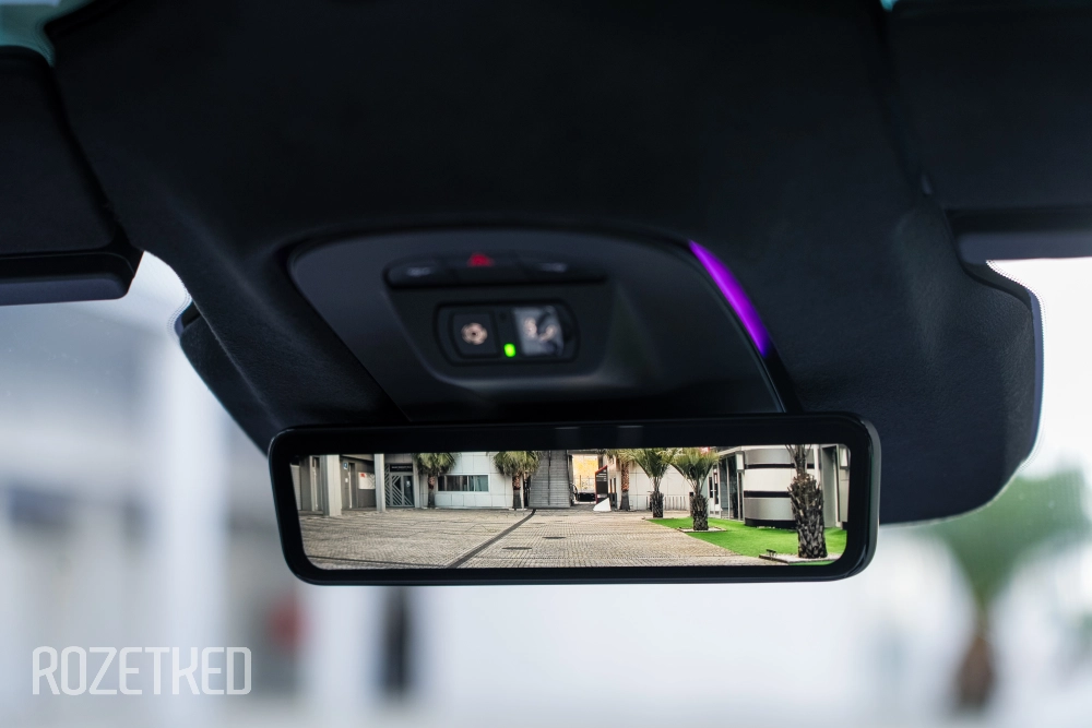 Но посмотрите в зеркало заднего вида. Замечаете? Верно, это тоже экран для камеры сзади. Регулировать можно только вверх и вниз, и к такому тоже нужно привыкать, но куда проще, чем к боковым зеркалам. Видимость у такого решения куда лучше, а ещё в пробках можно детально разглядывать водителей сзади. Сразу скажу о приятном бонусе: в машину уже встроен регистратор, с помощью камер кругового обзора пишется ситуация как спереди, так и сзади. Ну хоть на чём-то можно сэкономить. Бонус — у камеры заднего вида есть омыватели, что всегда полезно.