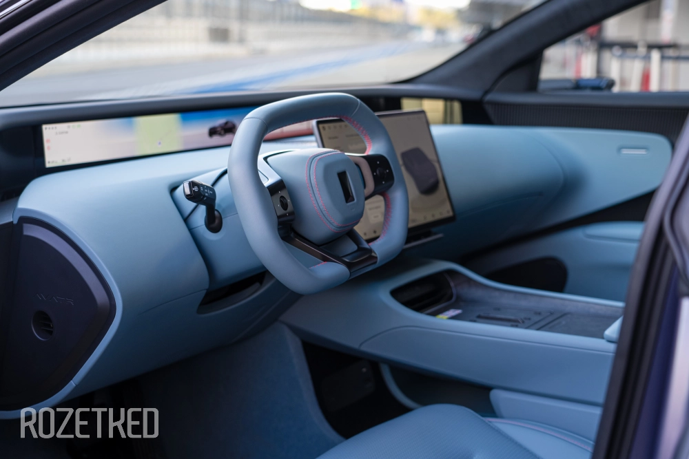 Дальше стоит обратить внимание на руль. Точнее — штурвал. При его создании вдохновлялись болидами F1. Разумеется, регулировать высоту и вылет руля можно только с помощью джойстиков, доступно четыре направления, есть функция памяти и аж три уровня обогрева. Честно, привыкнуть к такой форме руля куда проще, чем к камерам вместо боковых зеркал. Но всё же мне нравится вариант гибрида, когда сверху колесо, а низ скошен. Каждому своё.