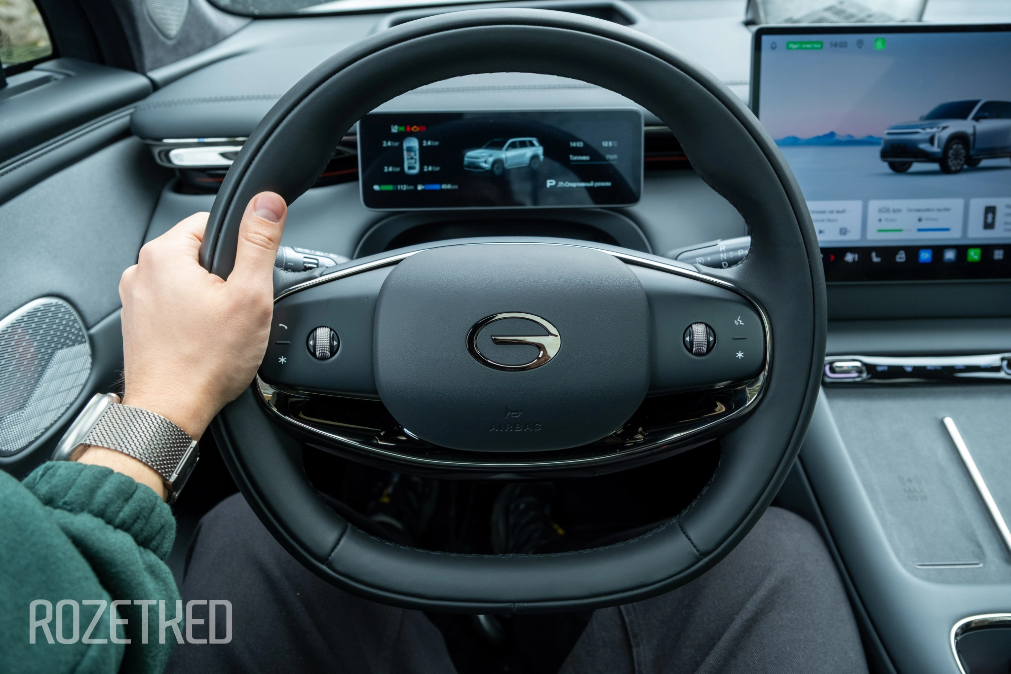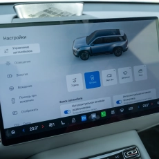 Руль регулируется и по вылету, и по высоте — сам он оформлен в стиле Tesla с минималистичными колёсиками по бокам. Справа за ним находится переключатель режимов трансмиссии — если ездили с отдельным рычагом по центру, то придётся привыкнуть. А ещё к тому, что в машине нет кнопки запуска двигателя. Открыли, сели, включили «дэшку» и поехали. Отдельной кнопки для ручника тоже нет — в режиме парковки он включается автоматически. Авто старательно избавляет водителя от лишних действий, сводя всё к минимализму.