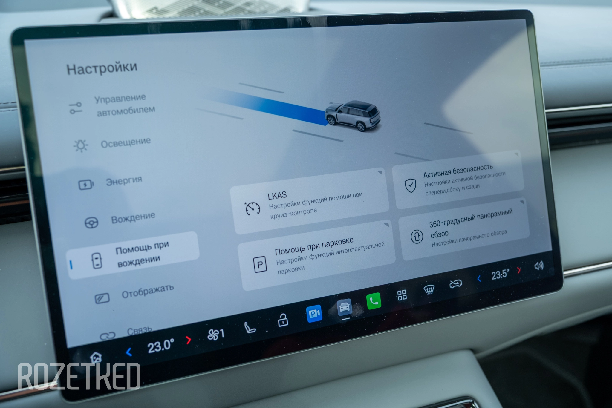 Кроме этого, полный зимний комплект опций для России, включая подогрев руля и привычный уже набор ассистентов вождения: камера 360 градусов, адаптивный круиз, мониторинг слепых зон, удержание в полосе, удержание дистанции и прочие. Местами они очень навязчивые, и приходится иногда бороться с ними, подруливать. Работают, как и везде, неидеально.