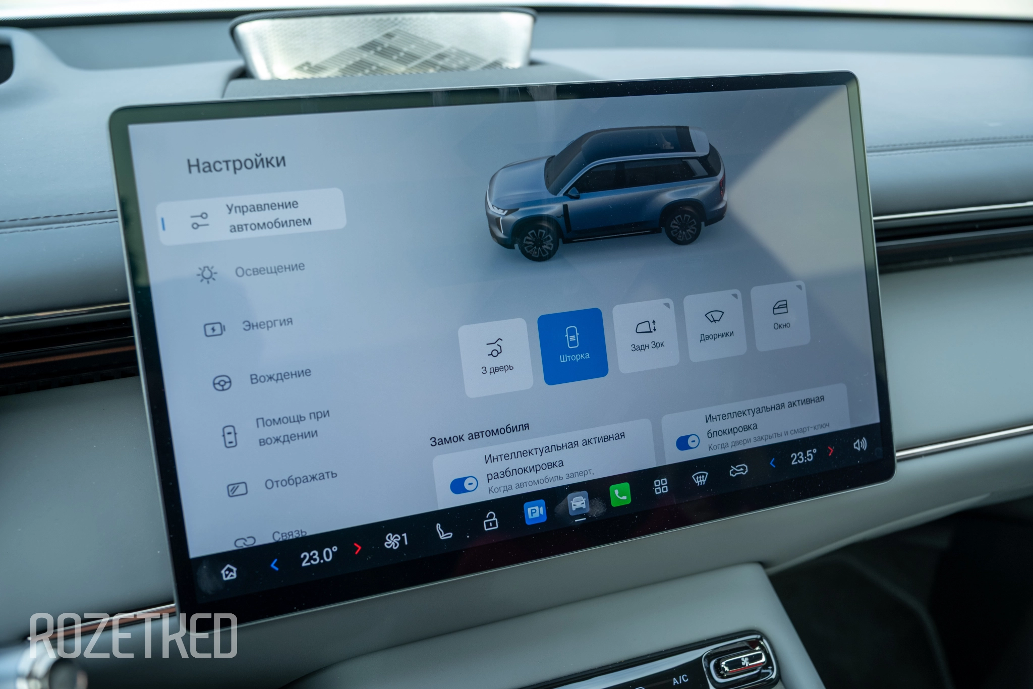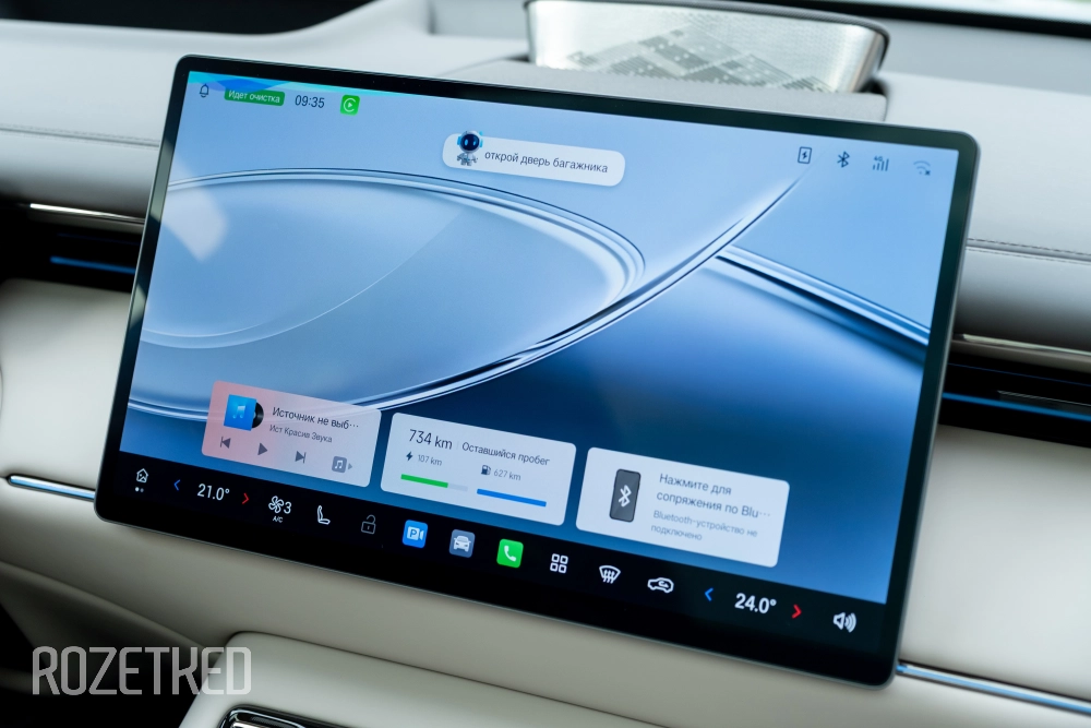 Есть и местный голосовой помощник, который может, например, открыть/закрыть окна или багажник, настроить климат и так далее. Причём вызвать его по голосовой команде может любой человек в салоне — микрофоны здесь раскинуты так, чтобы он слышал каждого. При этом водитель может запустить ассистента кнопкой на руле, и тогда ассистент будет слушать только его команды. Удобно.