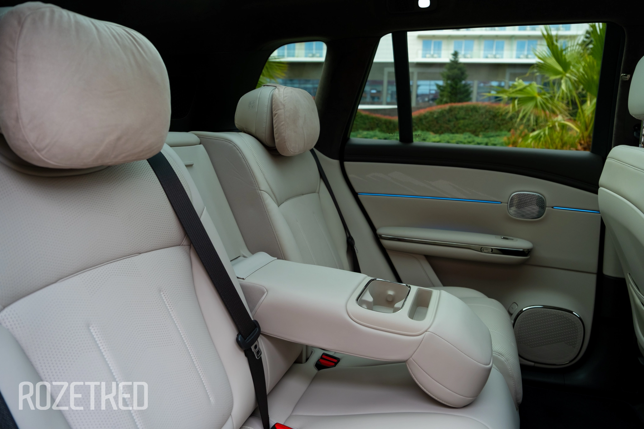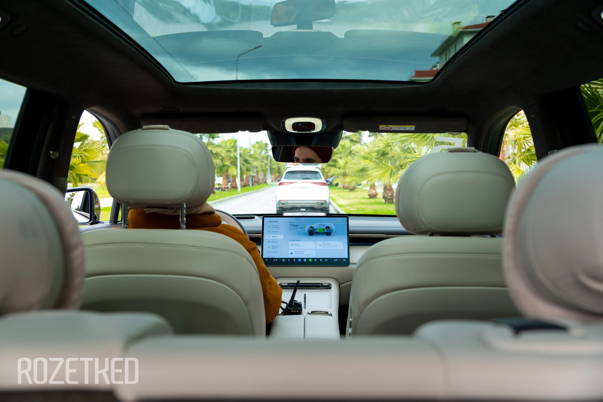 Пассажирам сзади, кажется, ещё более комфортно будет. Во всю крышу огромная панорама — от макушки водителя и практически до багажника. Чтобы увидеть заднюю часть, приходится поворачивать голову назад, так как она выходит за поле зрения. Ездить тут максимально комфортно и светло — по бокам большие двойные окна, сверху обзор на небо во всю крышу. В светлом салоне «воздуха» становится ещё больше. Шумоизоляция тоже на достойном уровне, и шум даже на магистрали слабо слышен.