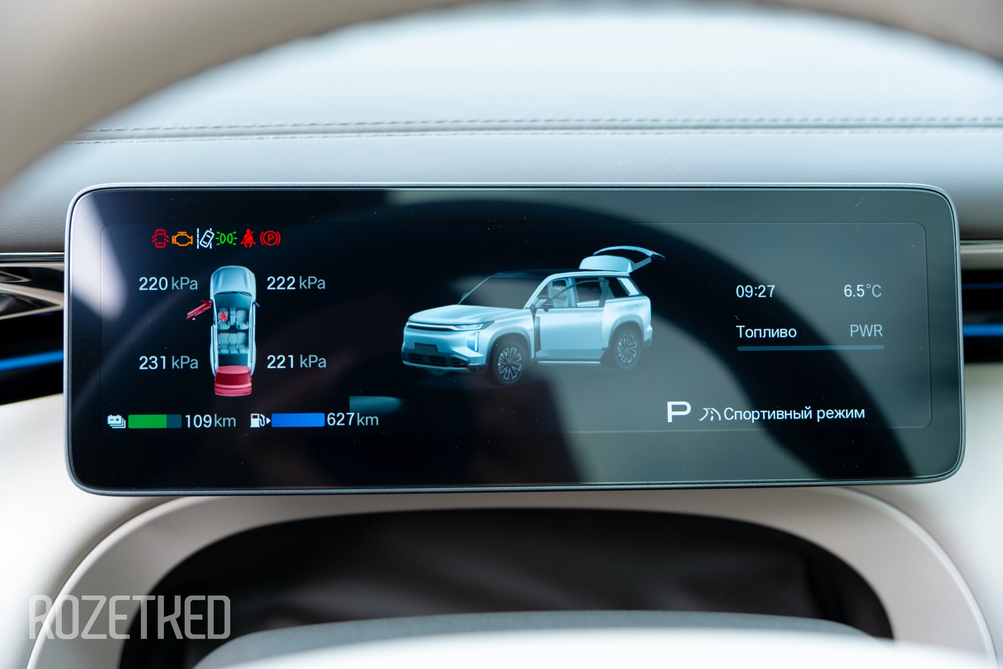 У водителя 8,9-дюймовая цифровая приборка, к которой в топовой комплектации добавляется проекционный дисплей. На него выводятся скорость, навигация, подсказки ассистентов. Если вы хоть раз видели современную проекцию, то вот здесь то же самое.