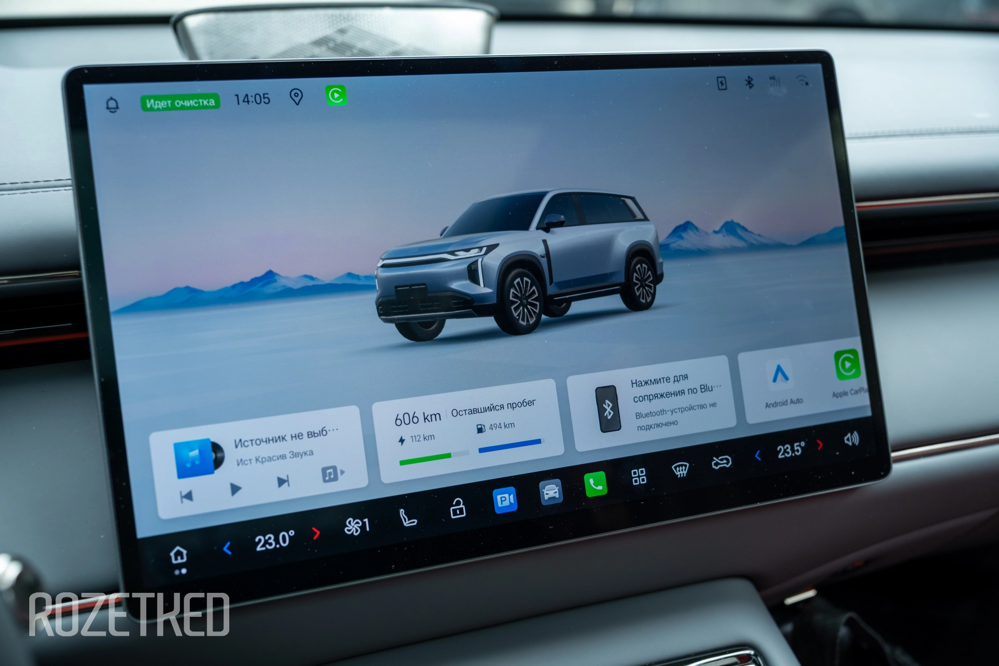 Беспроводные CarPlay и Android Auto работают. Интерфейс шустрый, насколько это возможно в авто, не тормозит и не задумывается. Нижняя панель с климатом и быстрым доступом к настройкам остаётся на экране даже при активном CarPlay — климатом можно управлять, не выходя из навигации.